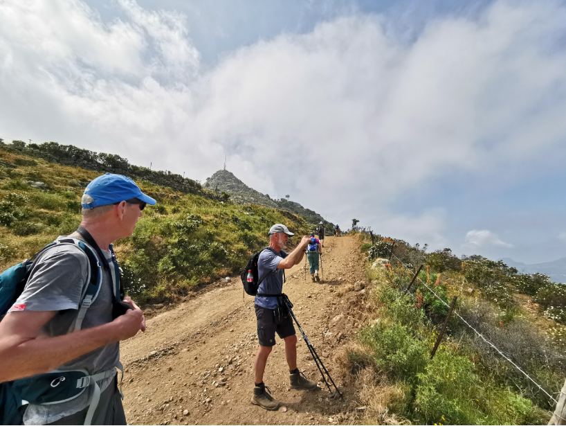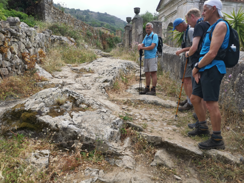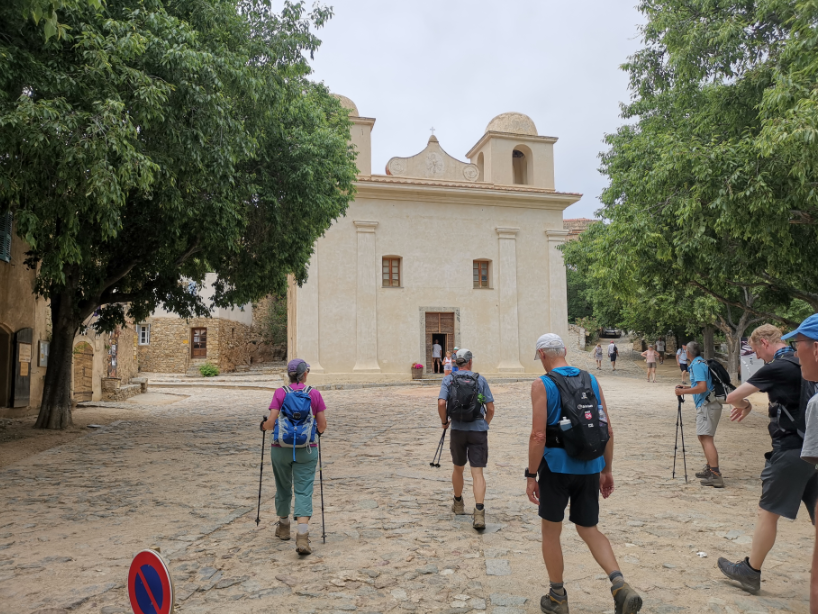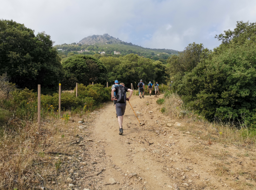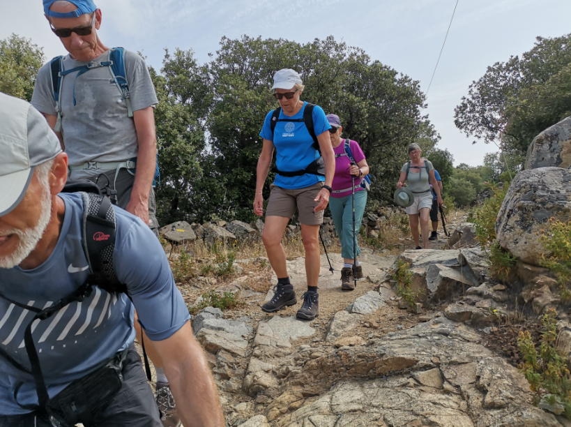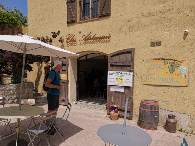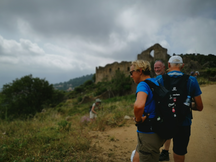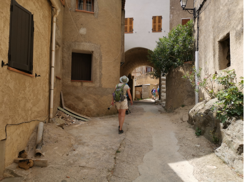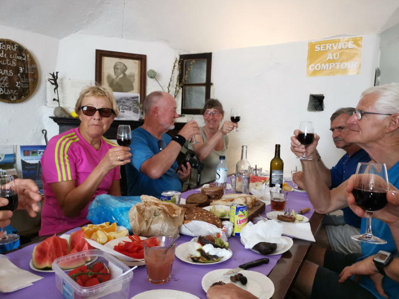 Hele gruppen er nu igen samlet og dagen starter som i søndags direkte fra hotellet, eller rettede tovet, hvor de enkelte grupper skulle købe ind til vores frokost (charcuterie). I dag går turen direkte op via byen, hvor vi hurtigt kommer ind på små smalle stier, der i begyndelsen følger byens indkørselsveje.