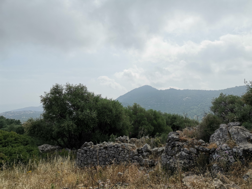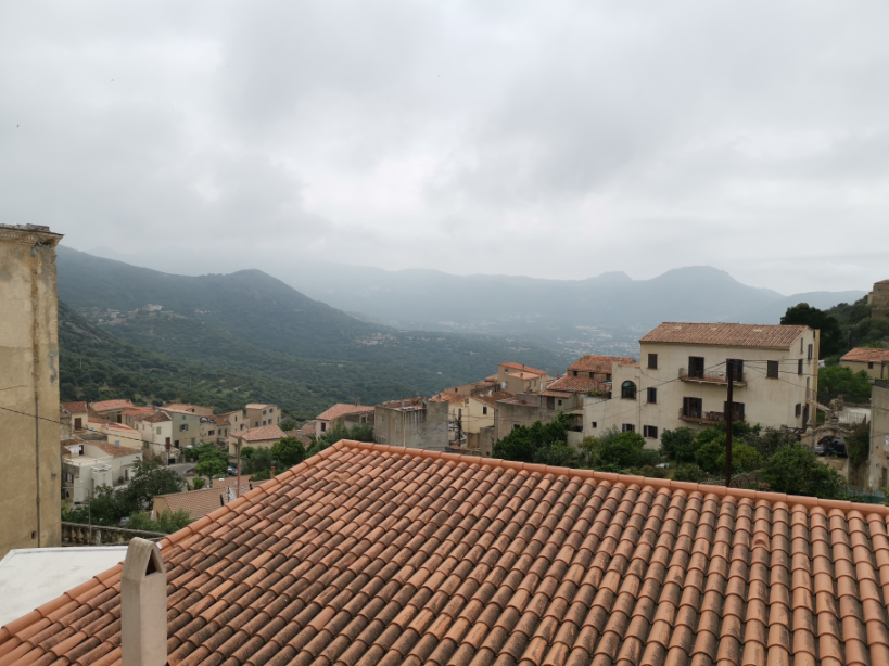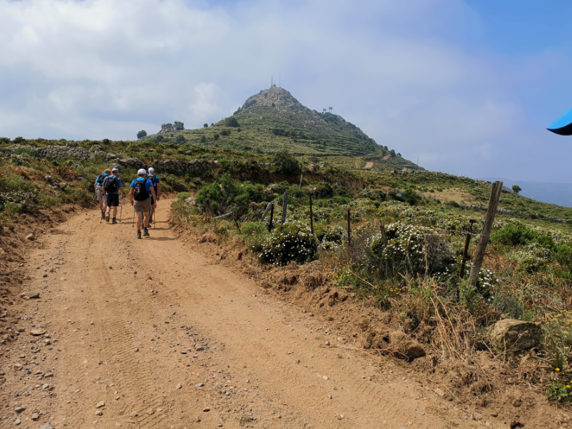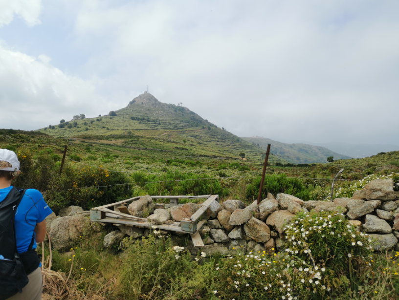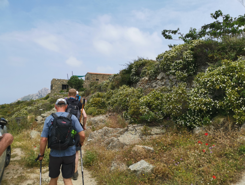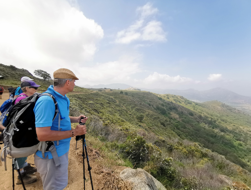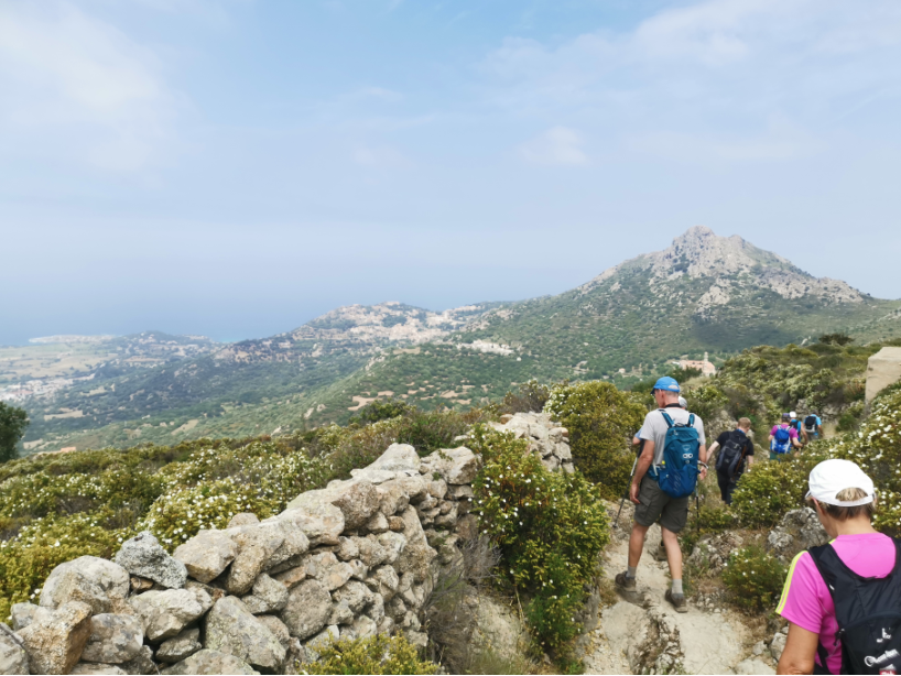 Efter godt 200 meters opstigning, holder vi dages første pause. Her er smukt udsigt over Ile-Rousse og kysten. Et æble og en masse vand er lige hvad jeg trænger. Mine to klæder (vandre viskestykker om man vil) som jeg bruger mig til at tørre sveden af ansigtet, er allerede nu totalt gennemblødt – det bliver vist en lang dag. Jeg forsøger derfor at spænde det ene klæde på min rygsæk så det kan blive tørret af solen.