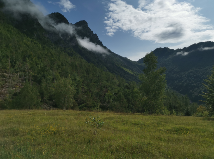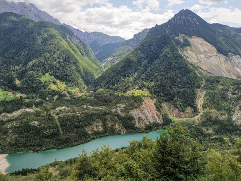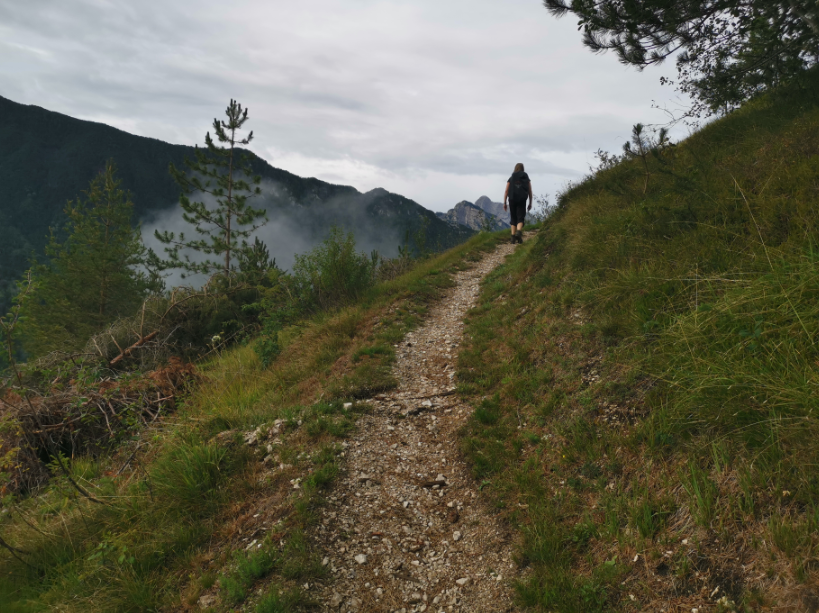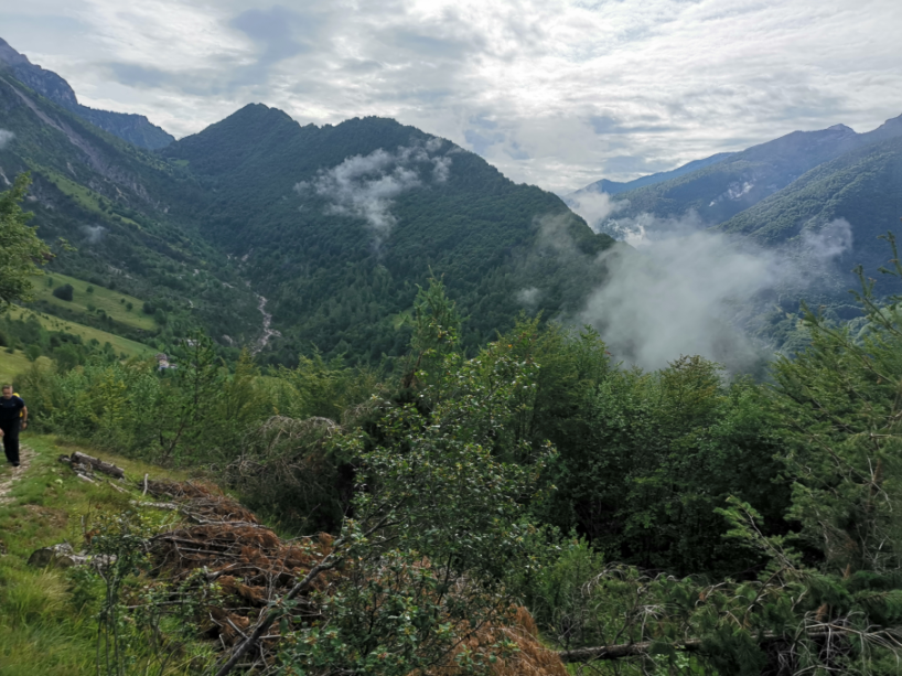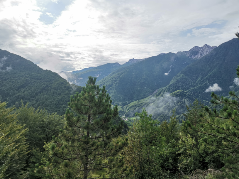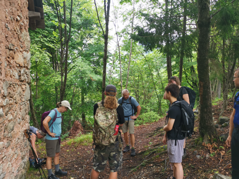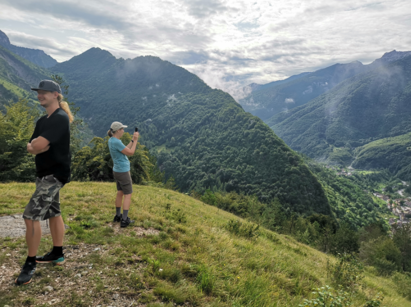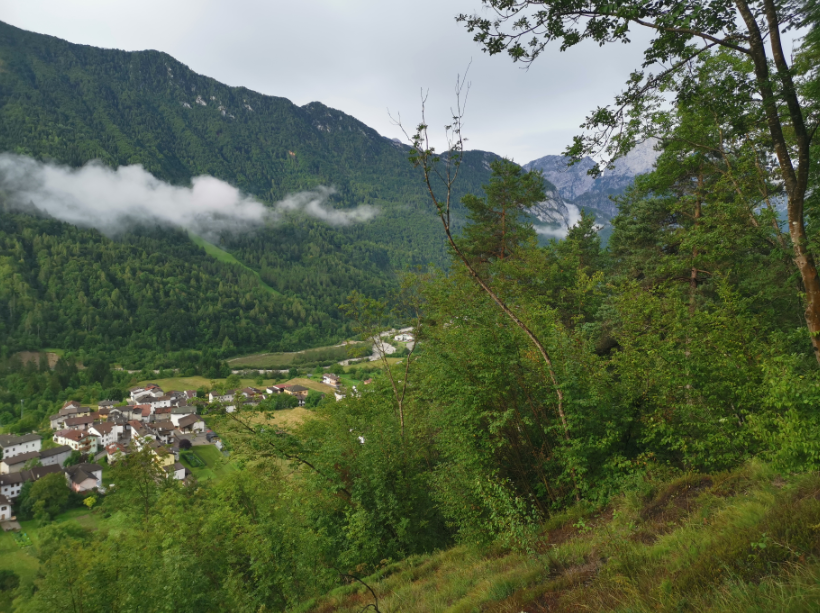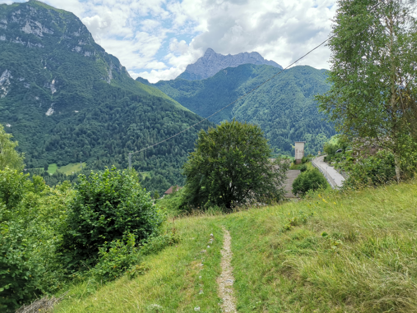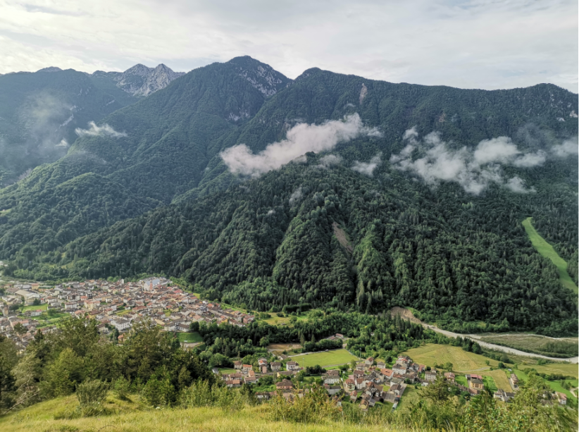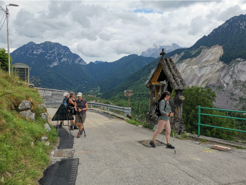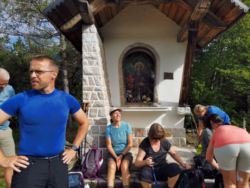 Vi når den lille top, hvor en lille religiøs bygning pryder landskabet og giver god mulighed for en lille pause med den skønneste udsigt over området og vores lille by Claut nede i dalen.