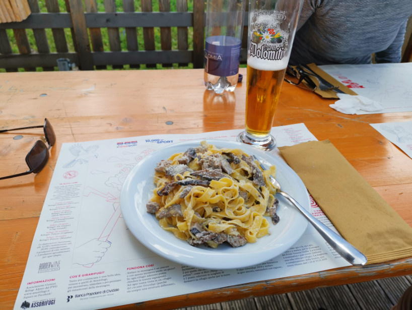 Vi starter med en forret, som er et dele fad med pølser, ost og lidt brød – det smager så fremragende at jeg kunne havde nøjes med det. Til hovedret får jeg en pasta med svampe, italiensk pølse og bacon, med en stor øl. Efterfulgt af en kop cappucino. Så jeg er godtnok også blevet mad, og vi slår alle mave en 45 minuter (vi er jo i rigtig god tid) inden vi enderlig går videre.