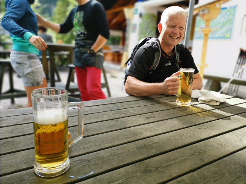 Vi er som altid foran planen og får derfor mulighed for at komme op til en ekstra refugé tæt ved parkeringspladsen, det kræver bare lige en stigning af en stejl skovsti på vel 50 meter. Vi er 5 der vælger at gå op for få en iskold øl mens de andre venter ved parkeringspladsen (vi afventer busserne skal komme).