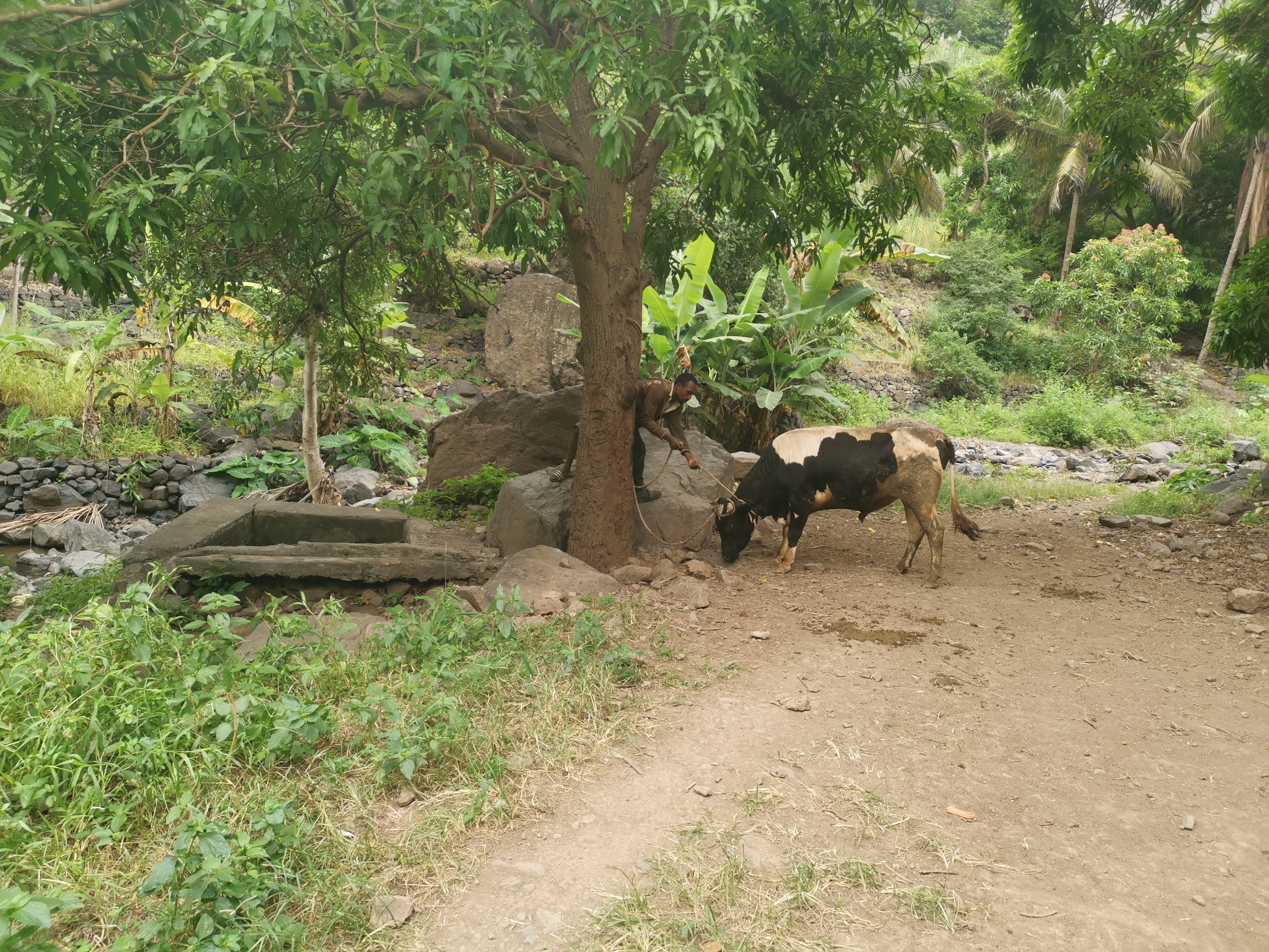 Vi er dog efterhånden fremme ved dagens frokost pause. Da vi nærmer os er der er tyr, som virkede er utilfreds. Et par lokale kæmper en brag kom med at få den under kontrol. Rebet der holder den er ved at knække med de lykkedes at få et nyt reb på. Heldigvis for den er ikke glad for at vi er der. Billedet er taget efter den fik nyt reb på slappede af. Resten af holder ankommer og Henrik fortæller at vi skal spise her… Men der er protester pga tyren så vi går et stykke videre.