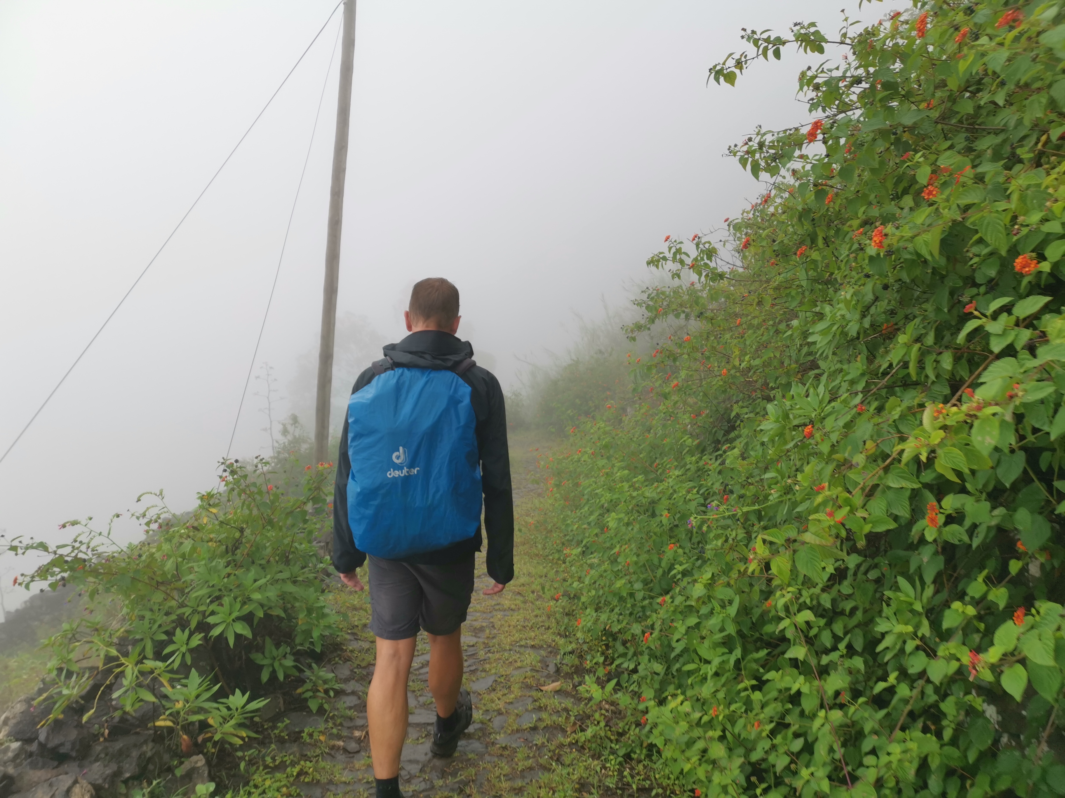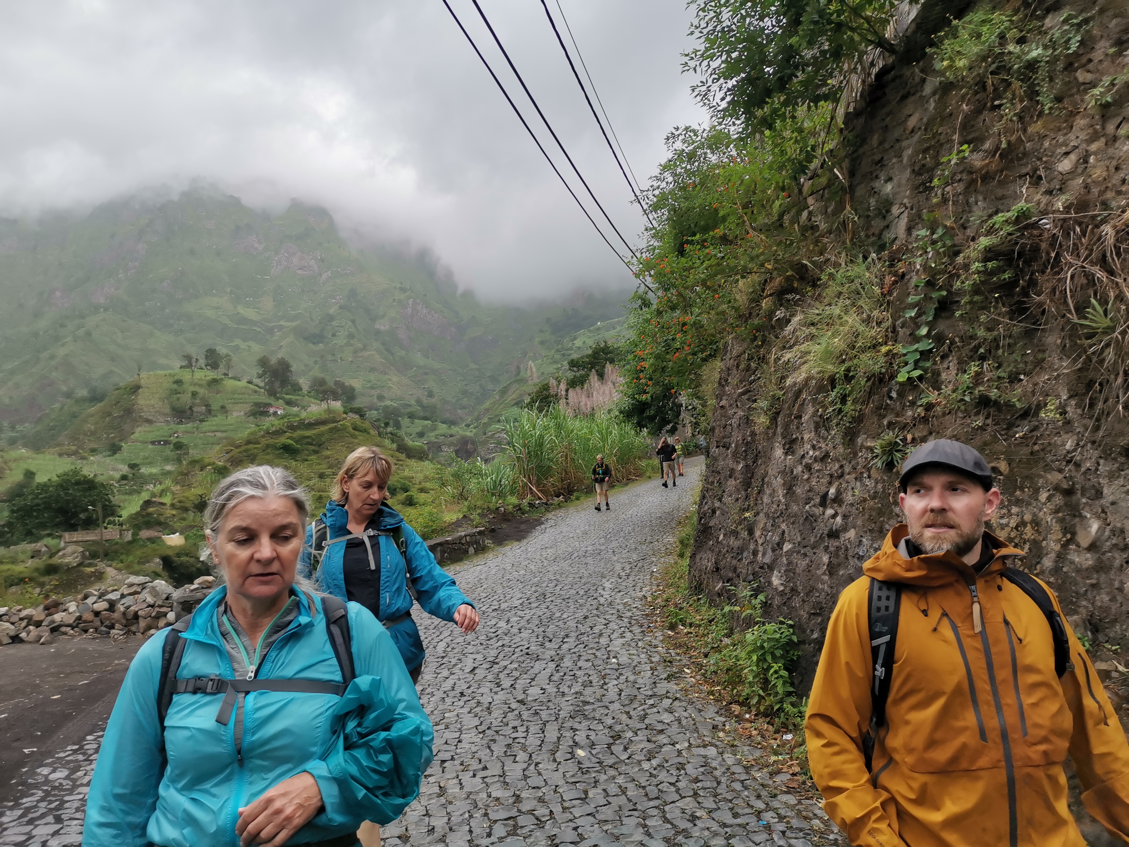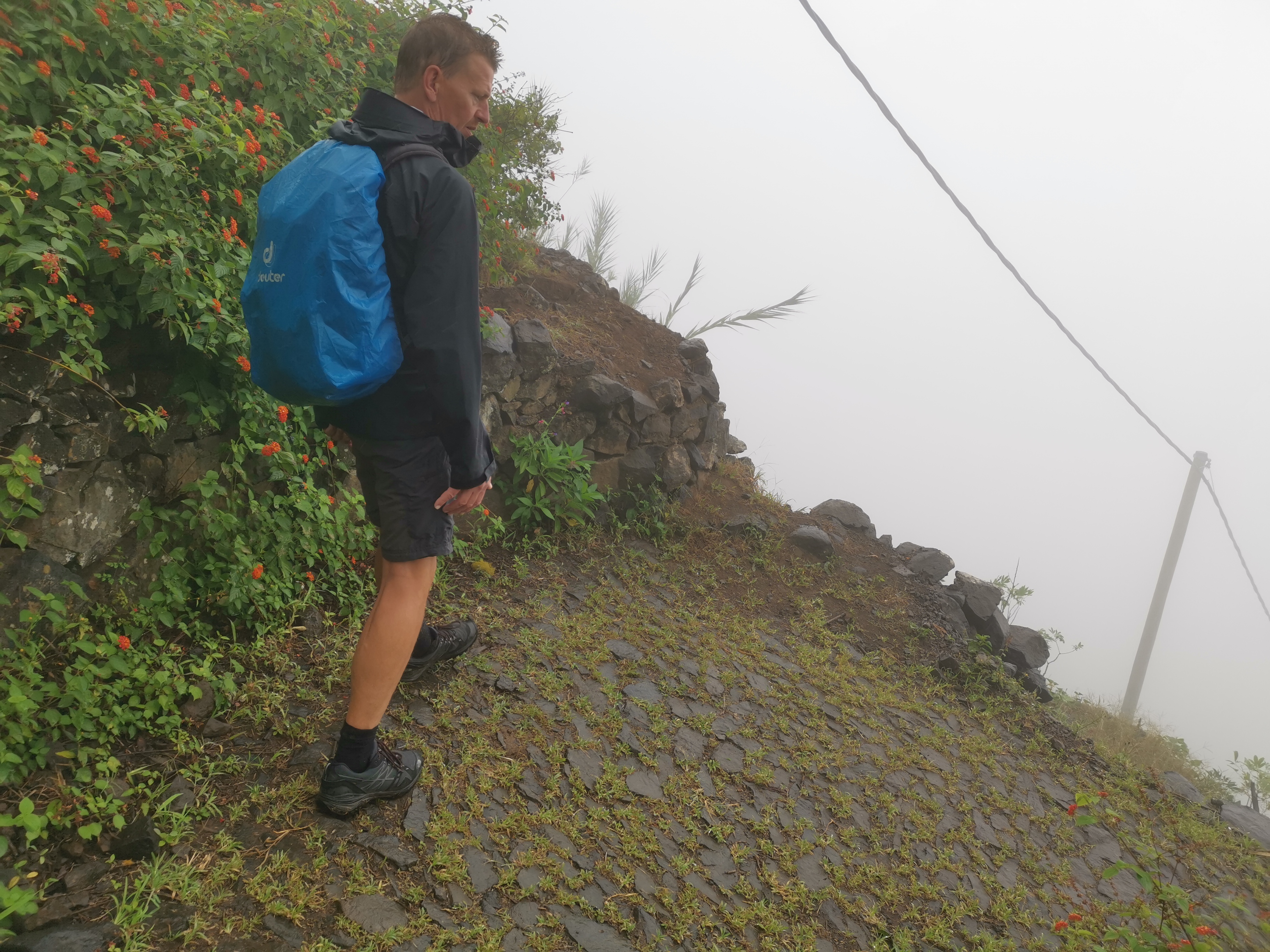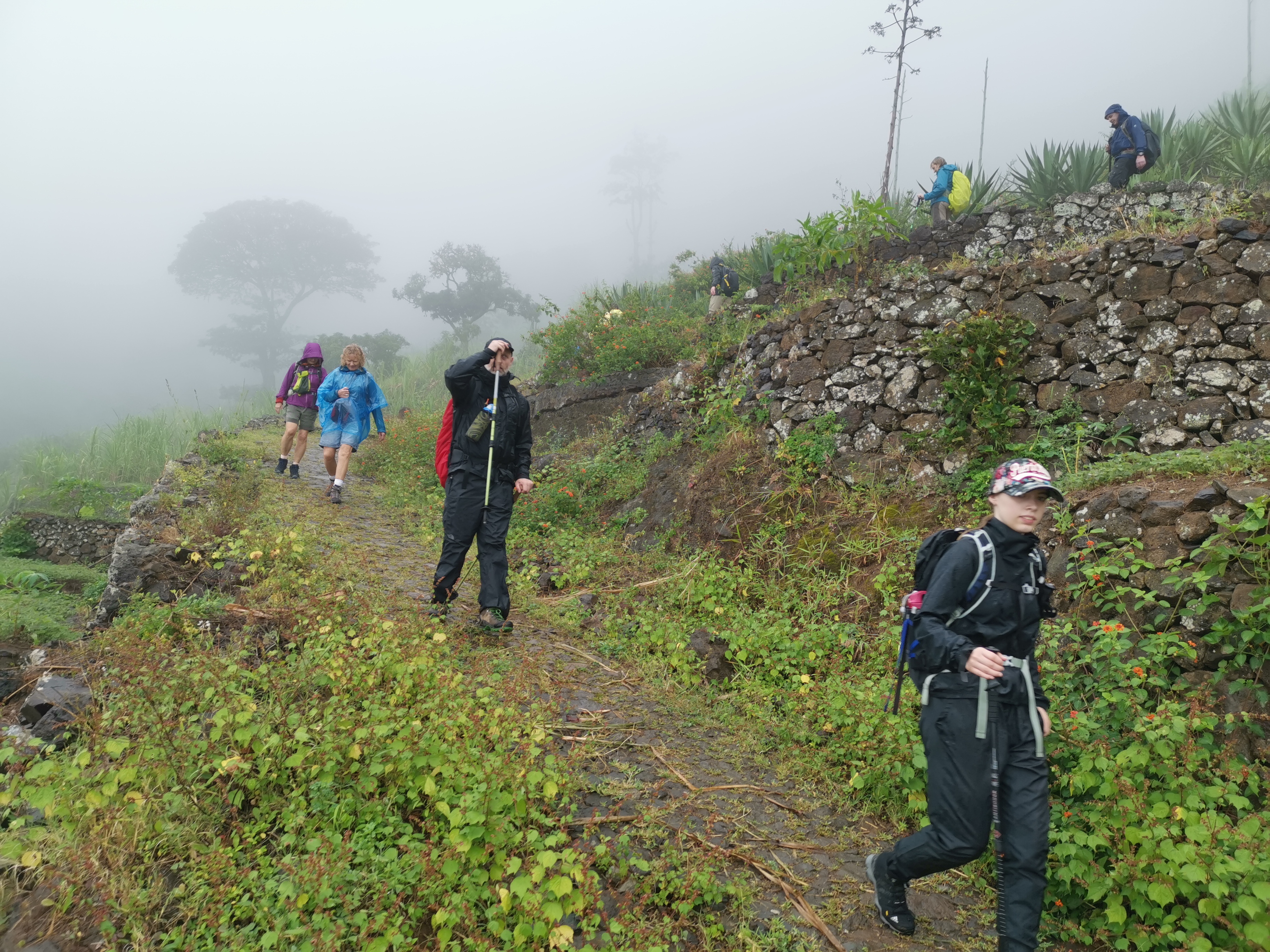 Netop som vi ankommet begynder regnen og det er desværre totalt overskyet. Så på med regntøjet og afsted det går. Vi starter med 100 højdemeters stigning.