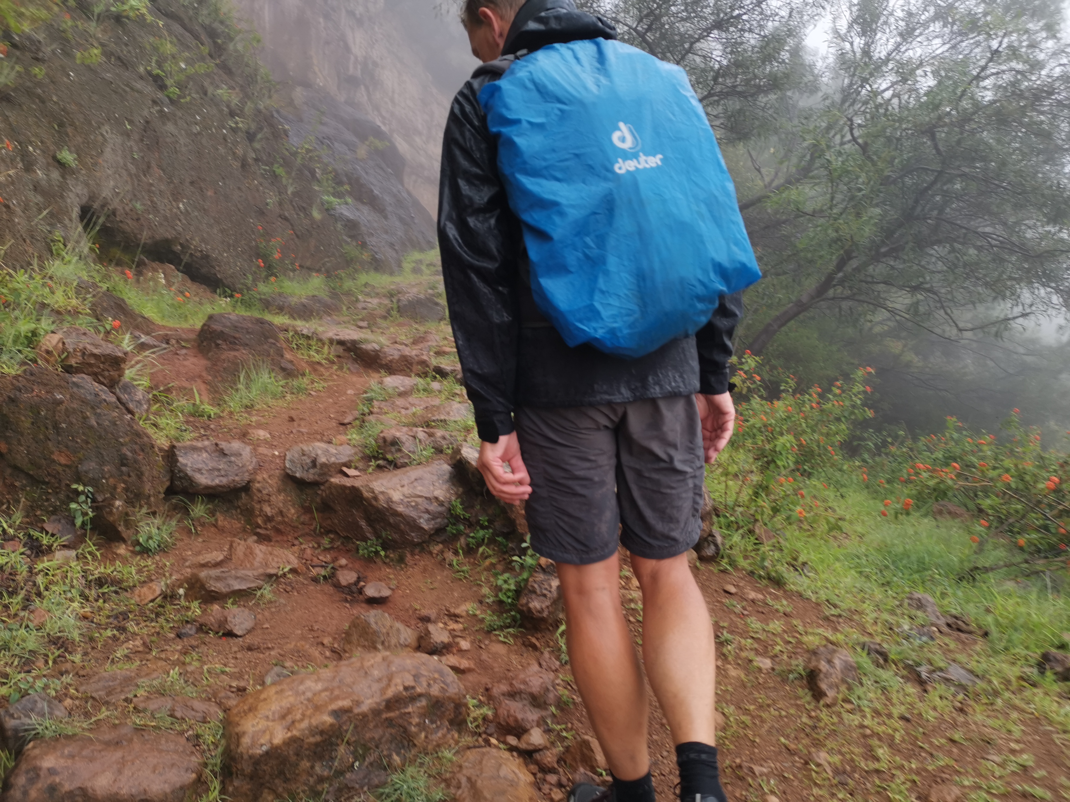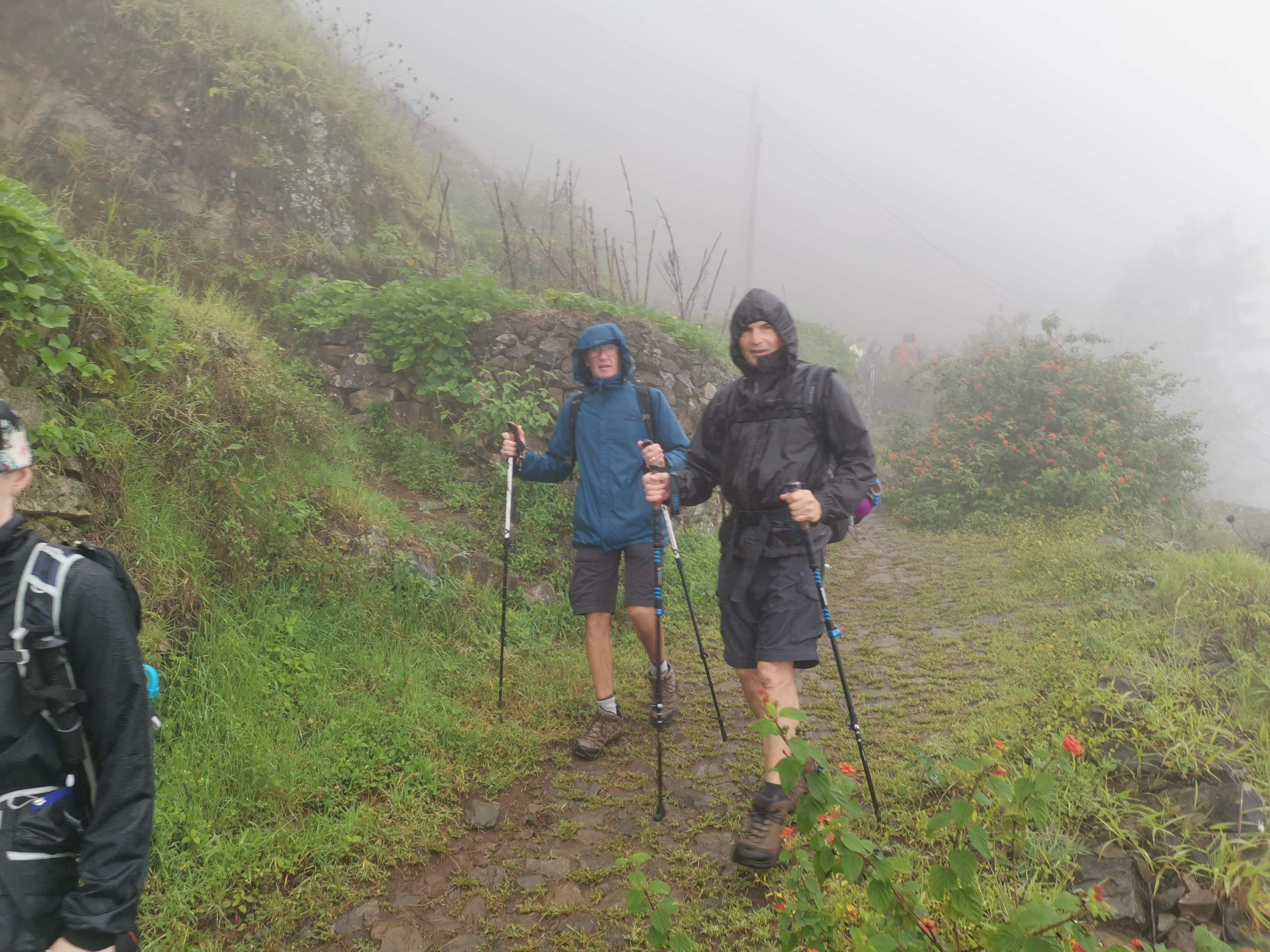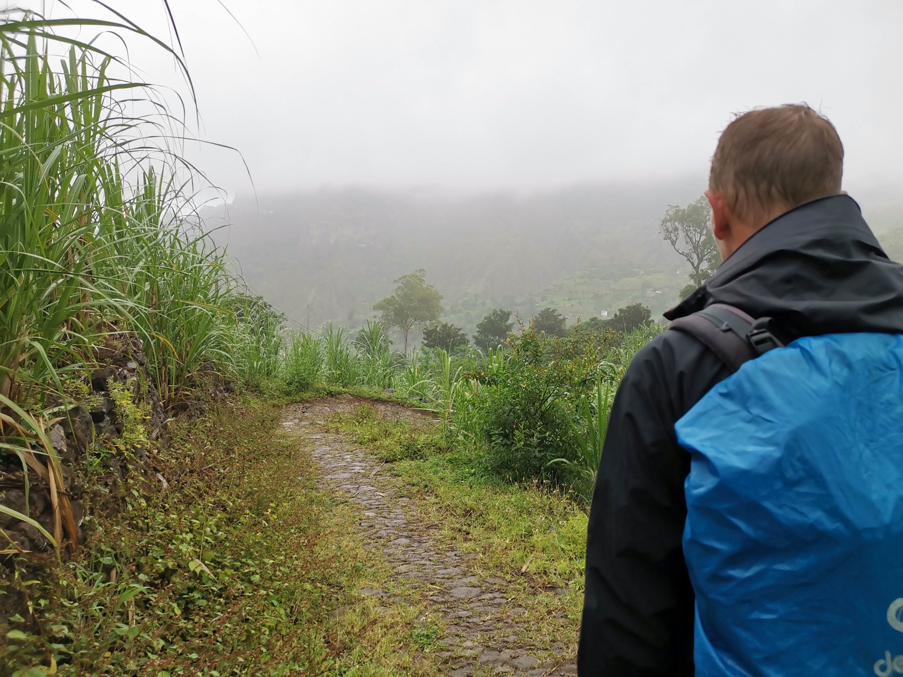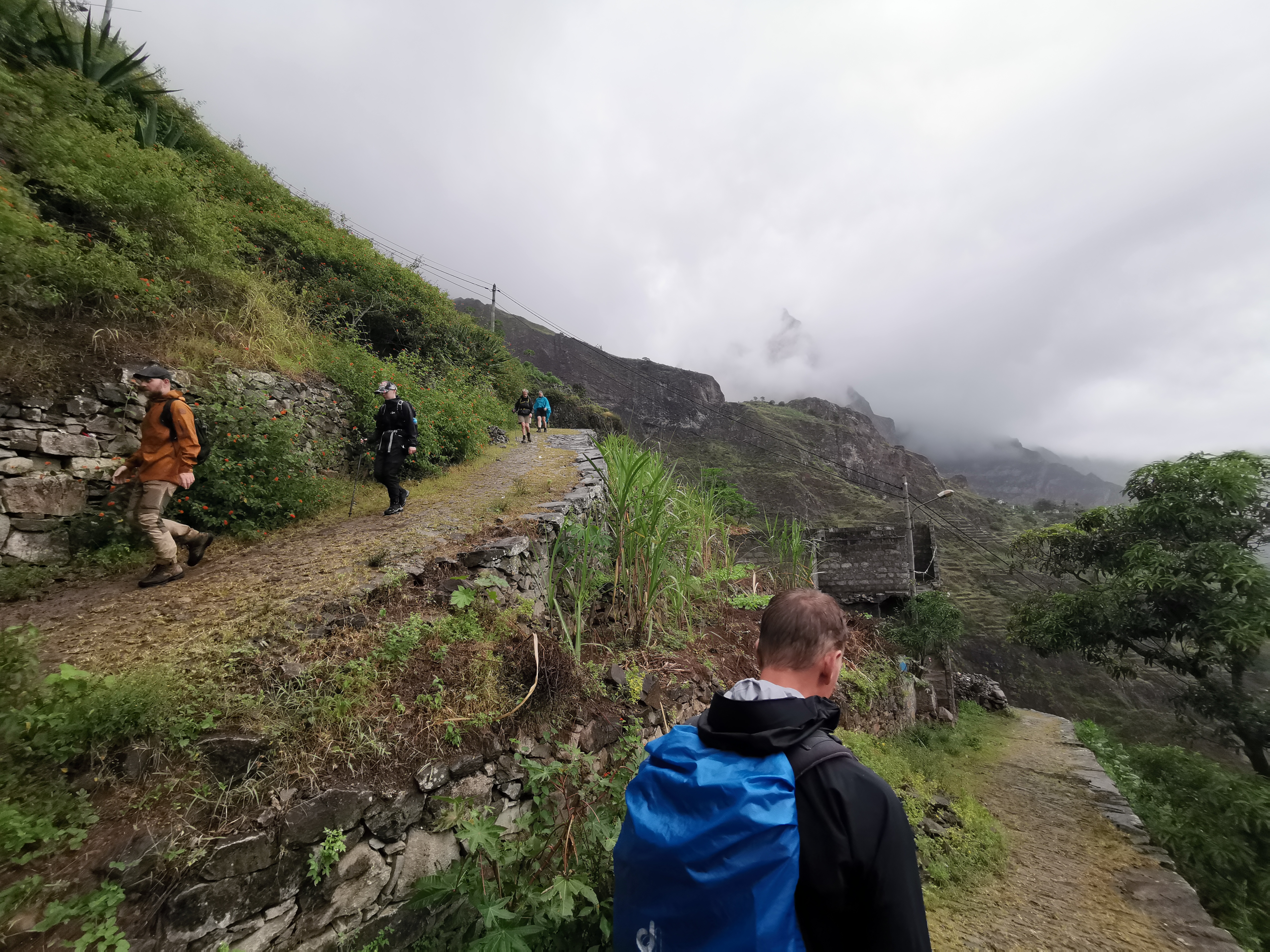 Netop som vi ankommet begynder regnen og det er desværre totalt overskyet. Så på med regntøjet og afsted det går. Vi starter med 100 højdemeters stigning.