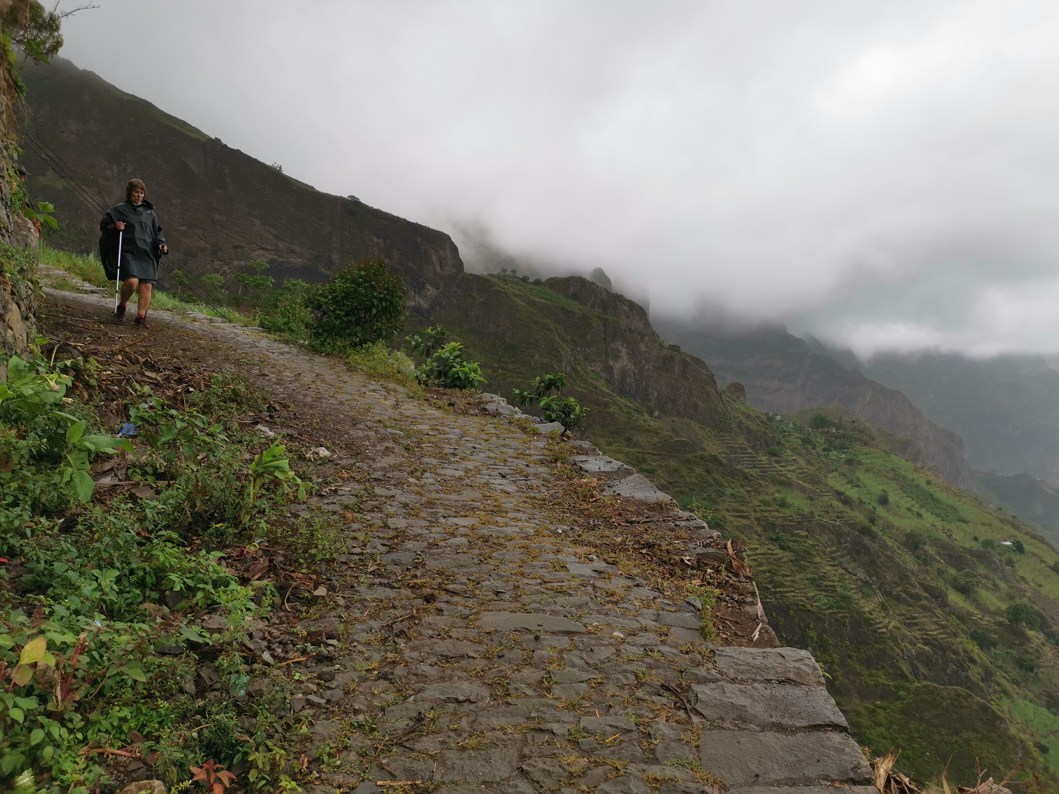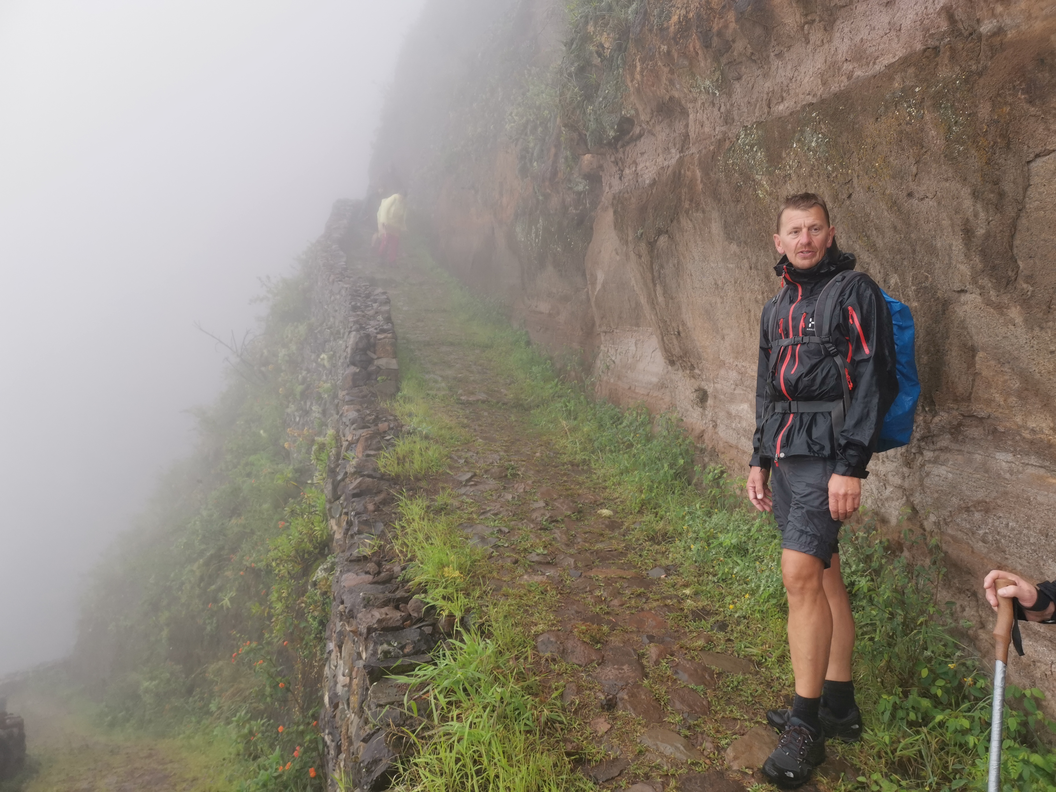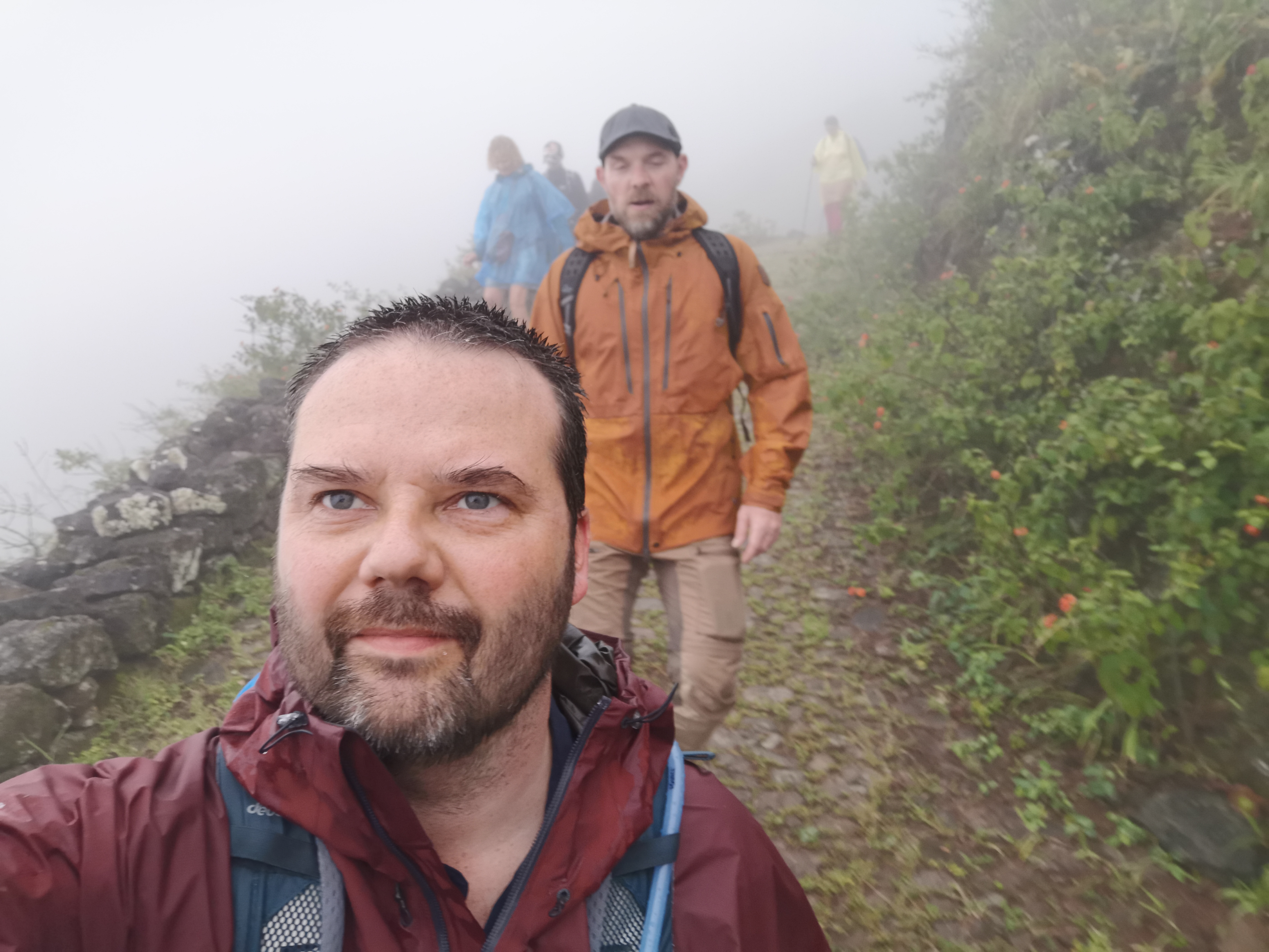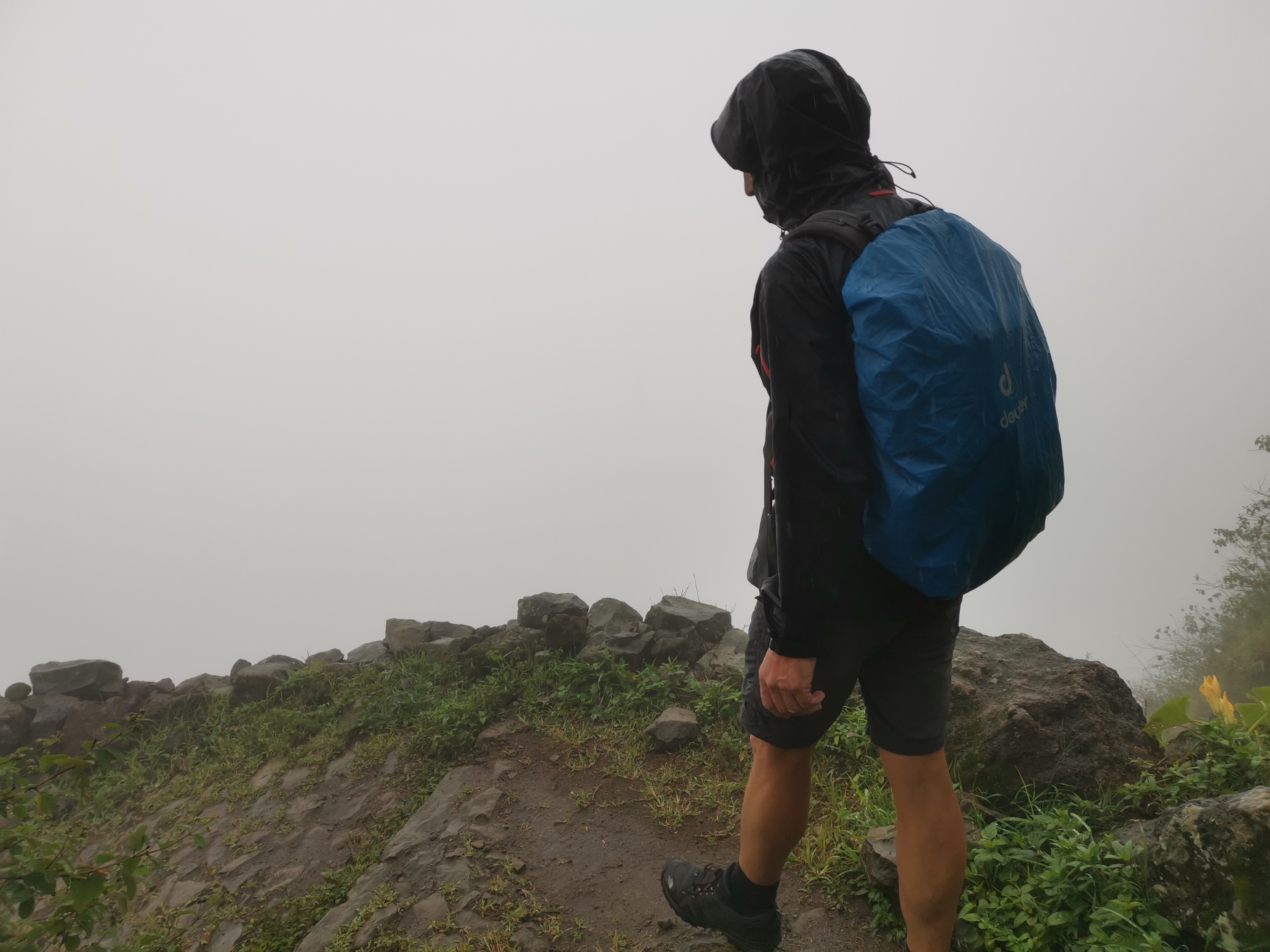 Netop som vi ankommet begynder regnen og det er desværre totalt overskyet. Så på med regntøjet og afsted det går. Vi starter med 100 højdemeters stigning.