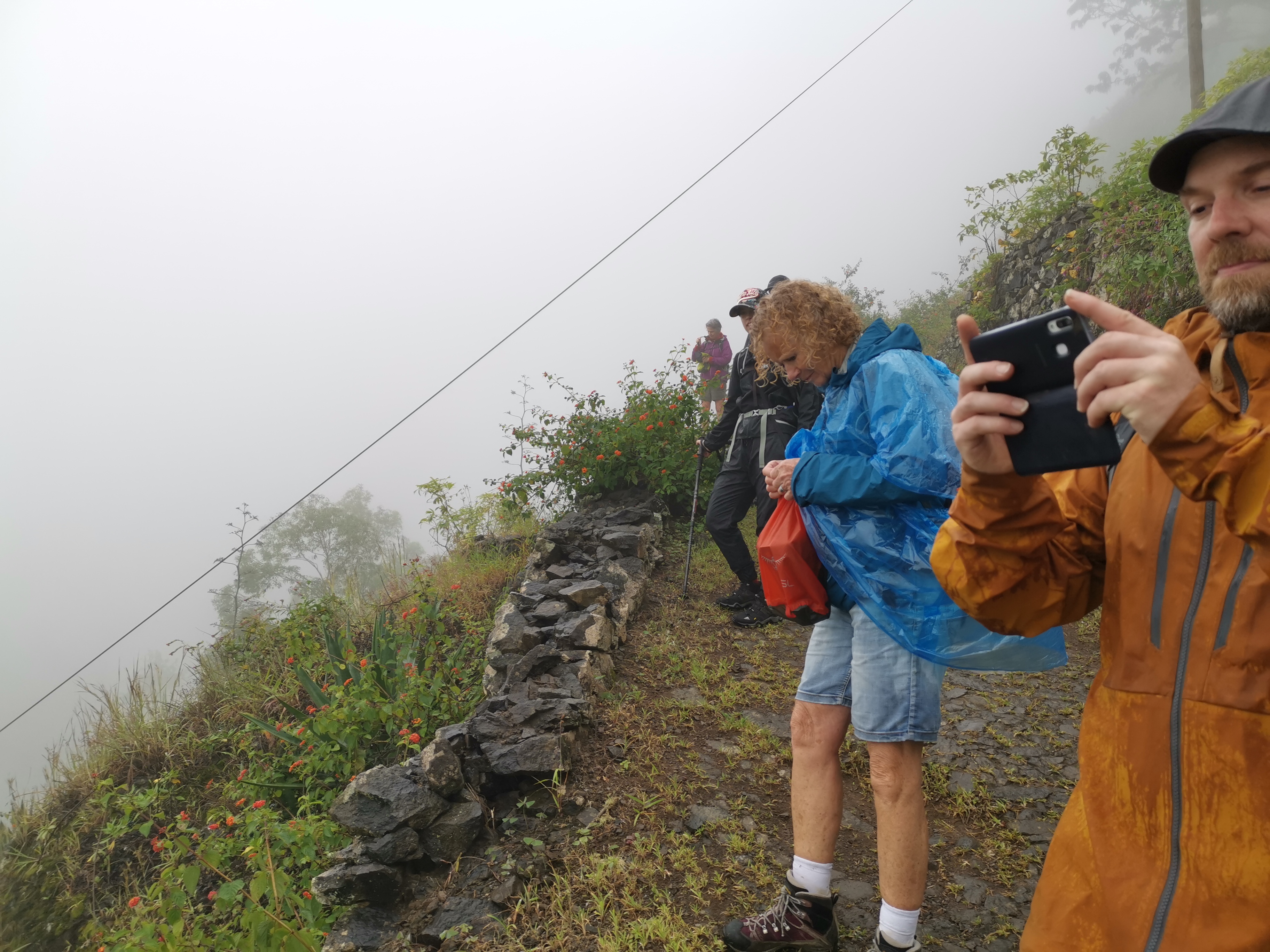 Regnen er heldigvis ikke voldsom, men derimod konstant og fortsætter i små 2 timer. Heldigvis løfter tågen efter godt 1,5 time, og vi begynder at se noget af den kønne udsigt vi er gået glip af. I dag skulle have været den smukkeste dag.