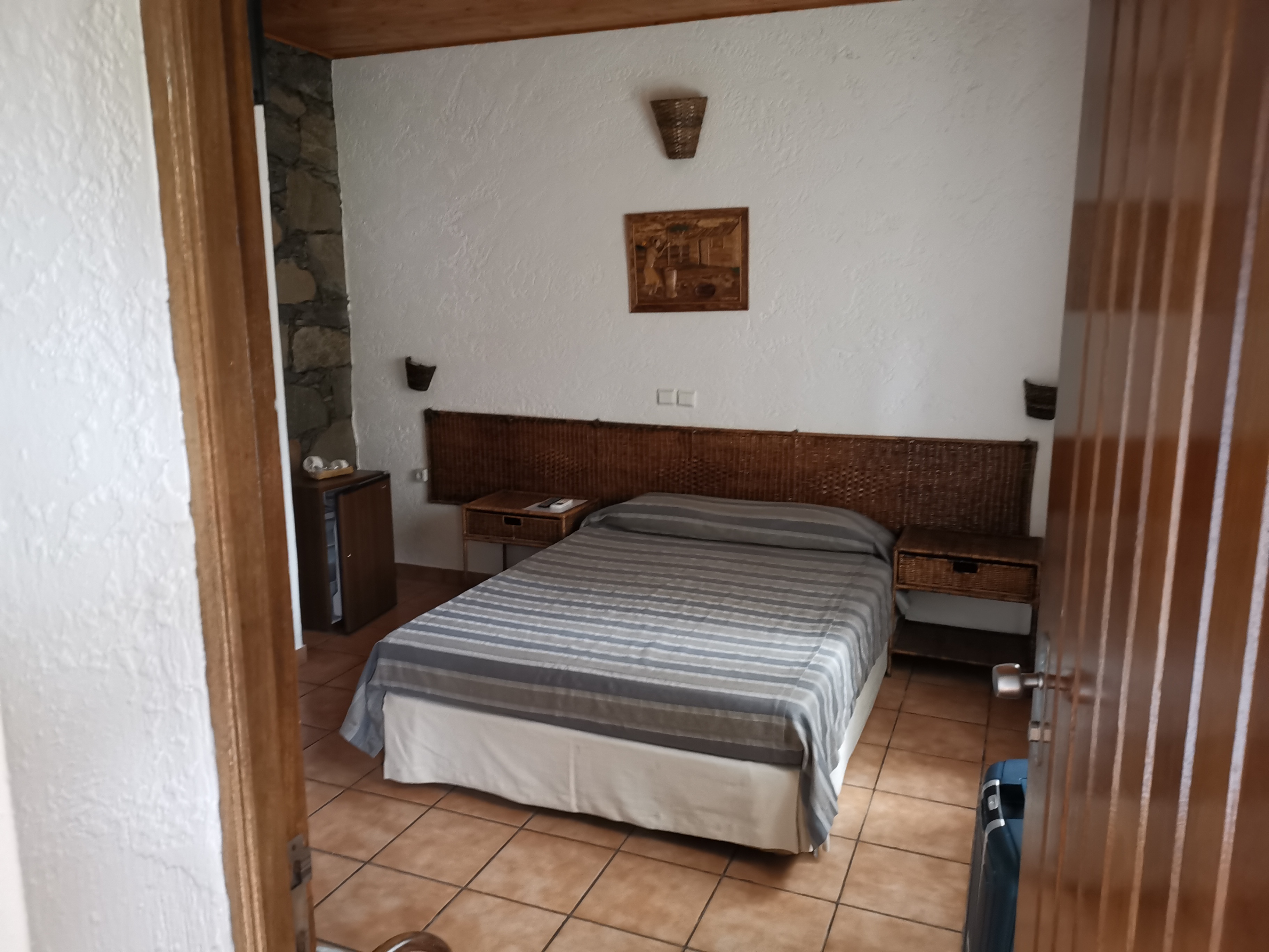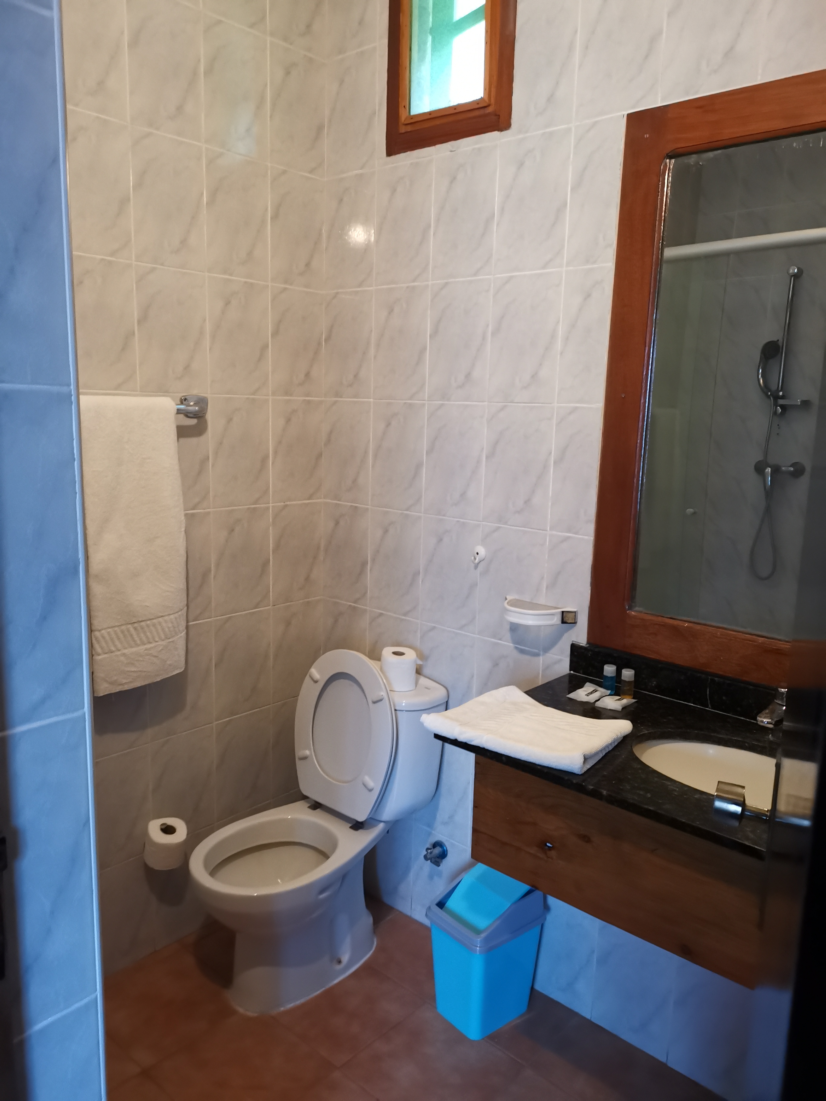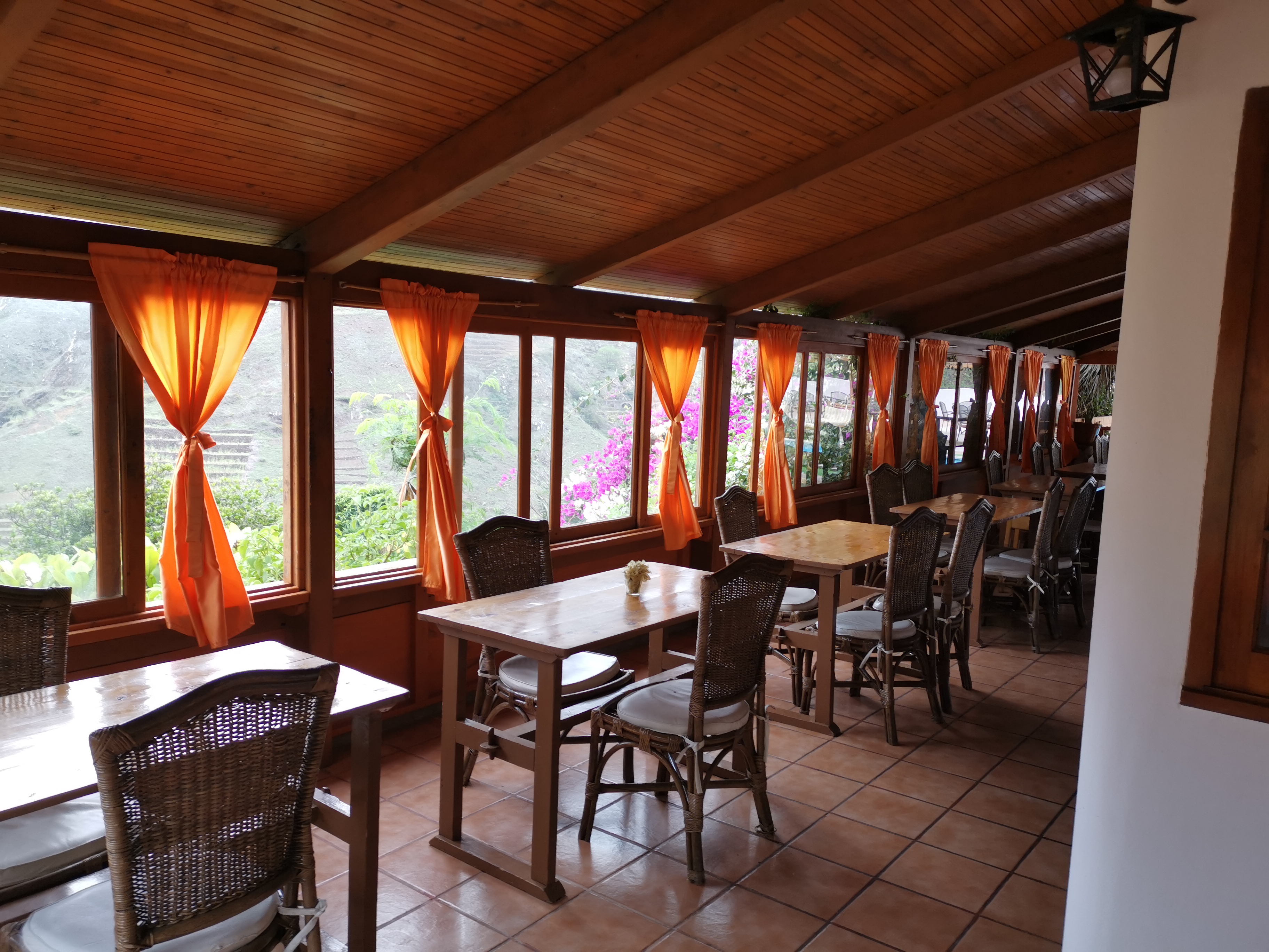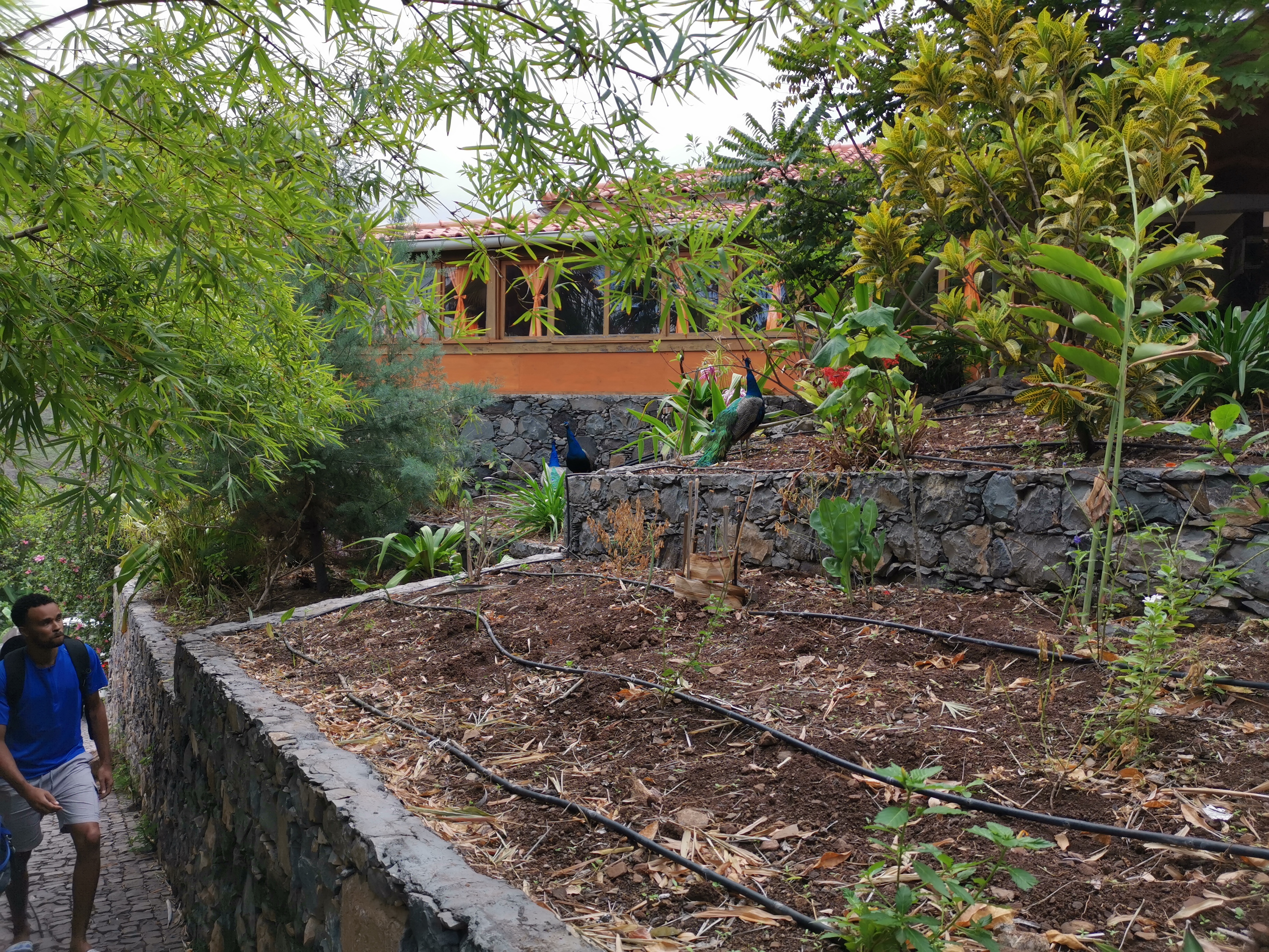 Efter vi alle er ankommet til vandet tager vi bussen til vores nye hotel, hvor vi skal overnatte 2 nætter. Wow, dette er hyggeligt og rigtig charmerende. Hotellet består af små bungalows som hver består af 2 separate lejligheder (som et rækkehus). Derudover at der en pool og stort terrasse område med den absolut smukkeste udsigt og de omkransede bjerge. Rundt på omrødet går fritgående påfugle, der ikke virker bange for menesker.