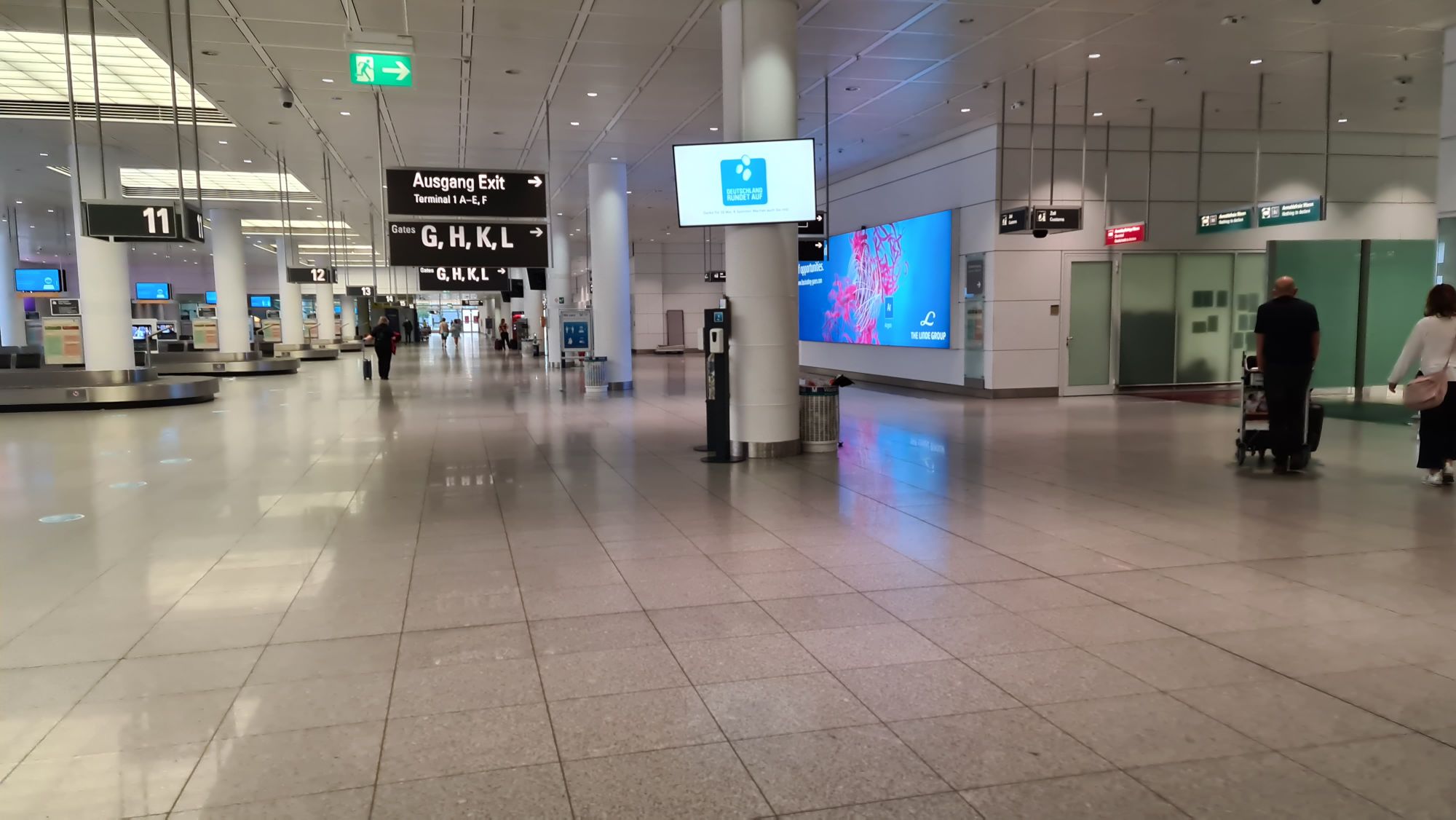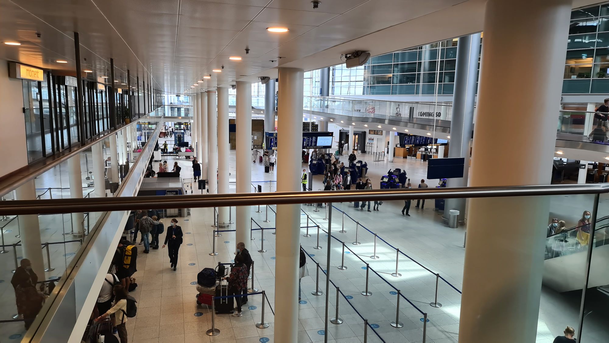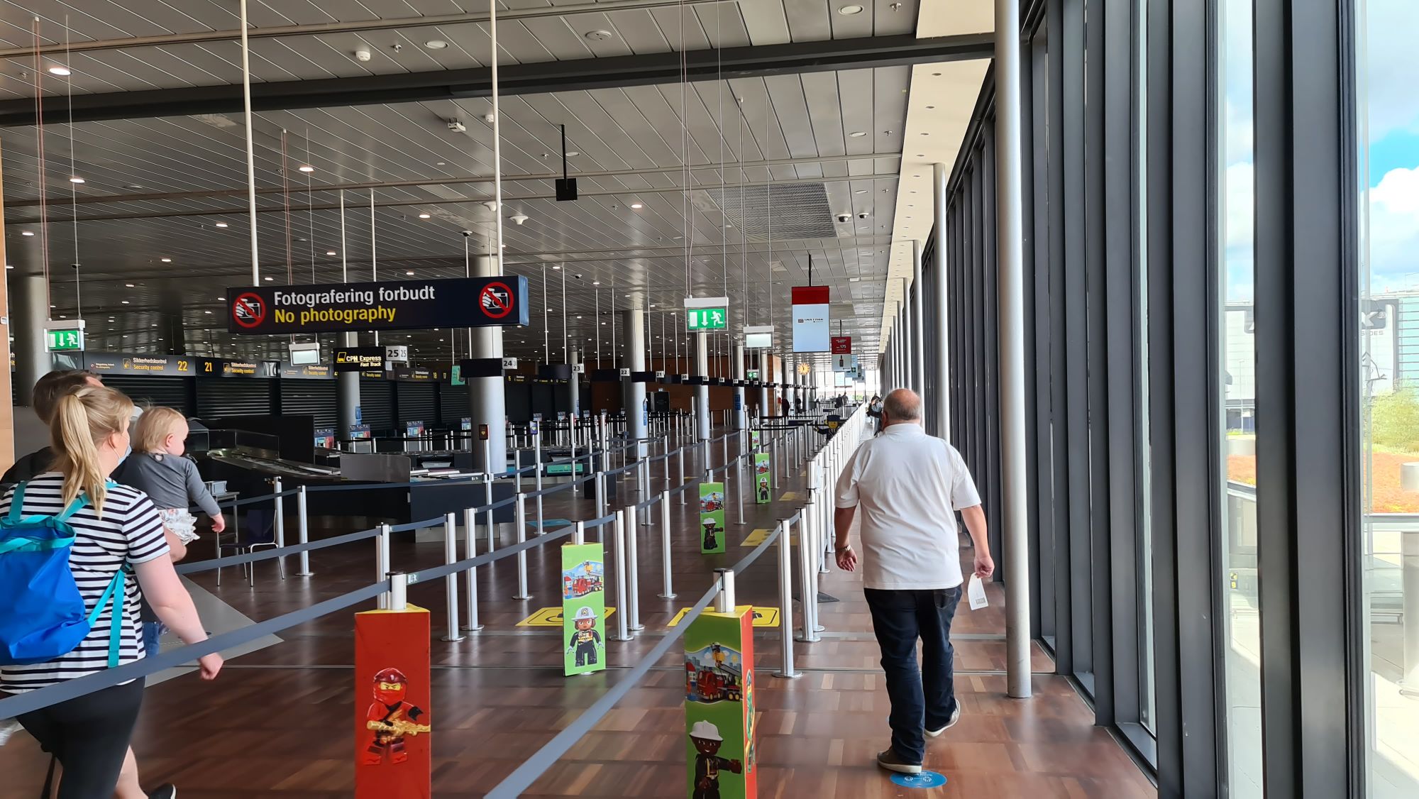 Lufthavnen er næsten tom for mennesker, kun 4 security gates er åbne, hvor vi taler om 5-6 personers kø i hver… der er trods alt midt i sommerferien og klokken 11.15, så der burde være fuldt med folk. At gå rundt j en forladt lufthavn hvor alle folk bære mundbind er som at være i en post-apocalyptic film. Eneste person Jeg så uden mundbind var enkelte lufthavnssatte som stod om hygge-snakkede og ikke mente du havde behov for maske (nok ikke lige efter reglerne og et forkert signal at sende).