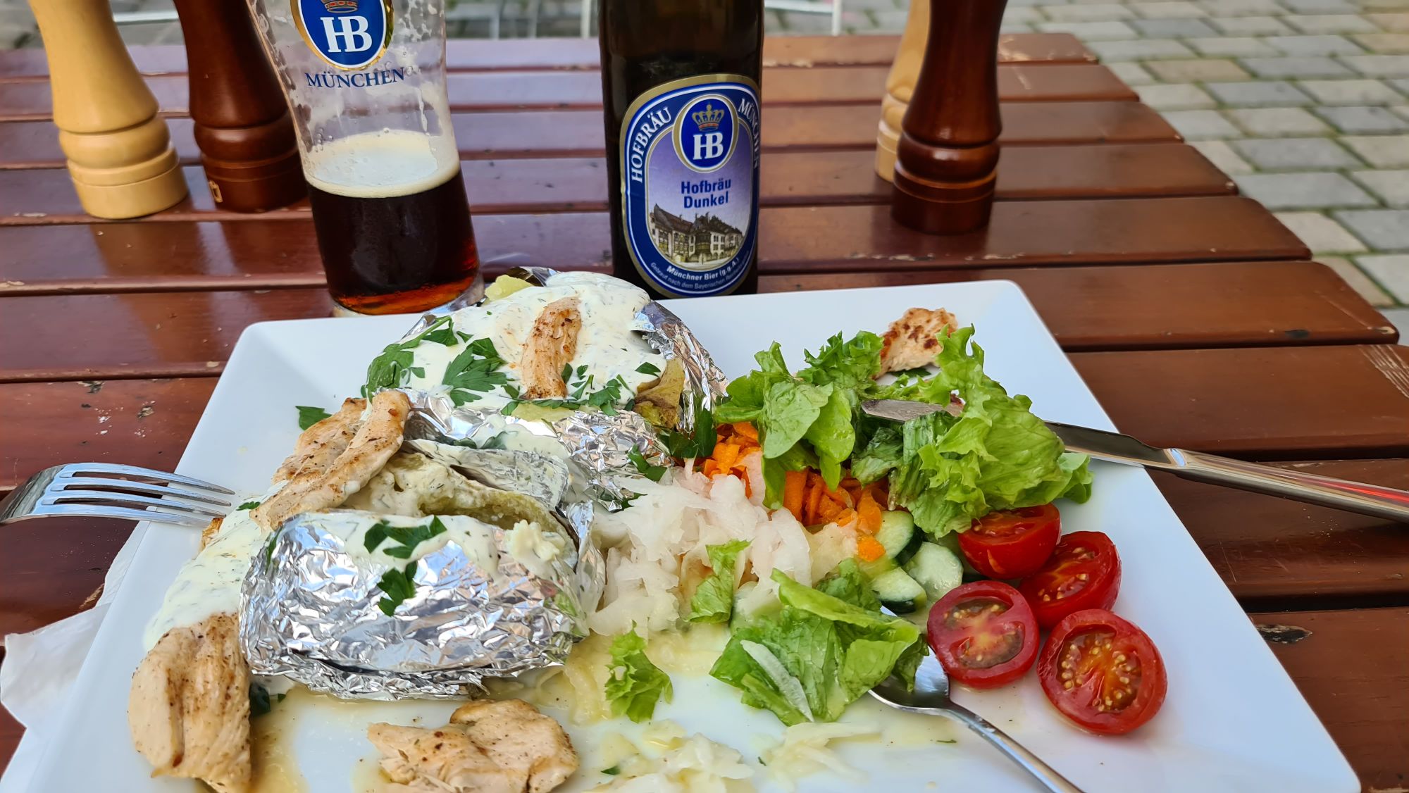Jeg går efter lidt udpakning rundt i den smukke by og finder en lille udendørs restaurant tæt på hotellet. Jeg har ikke behov for det vilde så jeg bestiller 2 bagte kartofler serveret med kyllingestrimler, salat og en fantastisk lun cremefraiche sovs med hvidløg og purløg….