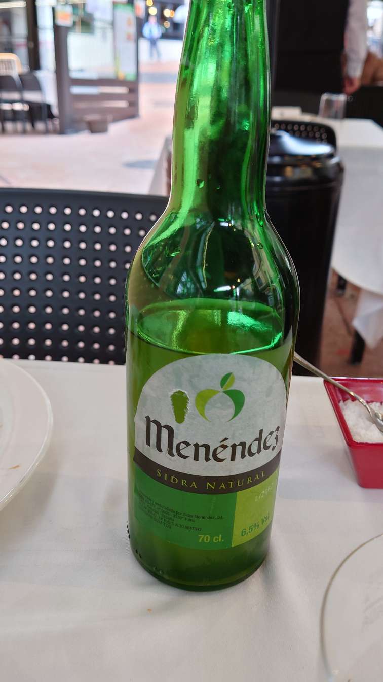 Efter godt 14km gang rundt i byen, var klokken endelig ved at være 14.00 hvor de spiser frokost i Spanien. Jeg finder et Sidraria, for at prøve denne spanske lokalitet. Sidra, er en lokal æble cider fra Asturias området. Det minder nu ikke meget om den cider vi kender fra Danmark eller Sverige.