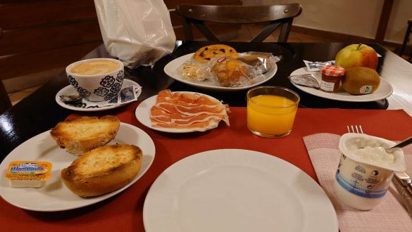 Noget kunne måske tyde på, at man ikke normalt kan spise morgenmad på hotellet, men at det måske er en speciel aftale SpainIsmore har med dem… Jeg ved det ikke, men jeg får i alle fald en skøn morgenmad helt alene. Jeg rører dog ikke store dele af de serverede ting… trøds jeg ikke rører ver halvdelen på bordet, jeg skal bestemt ikke have diverse kager til morgen, hvis jeg kan undgå det.