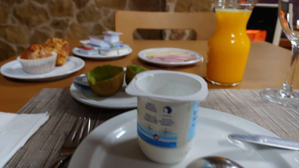 Morgenmaden så umiddelbart spændende ud, jeg starter med en yoghurt med en frisk Kiwi frugt, et par glas appelsinjuice og Café con leche. Jeg har fået ost og skinke, syltetøj mm, men modtager aldrig nogen bollet eller toast brød, d t var nok en forglemmelse. Men det betyder at det eneste jeg spiser udover yoghurt og kiwi og 2 små kager. Men det er nok til hele turen.
