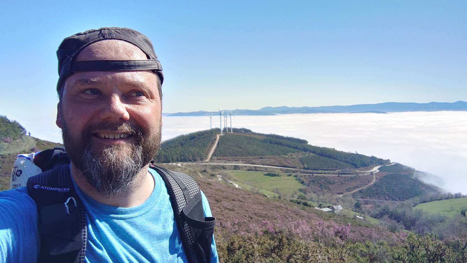 Efter at have gået en hel del kilometer på en stor landevej uden biler, drejer stien op til en lille landsby… kort efter kommer solen pludselig til syne. I begyndelsen ganske svagt, men så… Jeg er kommer over sky-laget, og ser nu omgivelser i alt deres flor, men jeg ser ned på skyerne. Tænkt at have vandret knapt 3 timer inde i en sky. Ikke så underligt at luften have været så klam og kølig hele formiddagen.