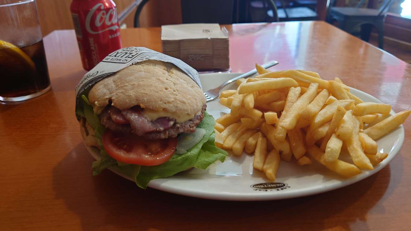 Jeg bestiller en absolut skøn burger i ciabatta bolle, nogle pomfritter og 2 colaer. Slutter til sidst med en mini café con leche. Klokken er 19.30 og jeg går hjemad… Jeg må vist snart i seng.