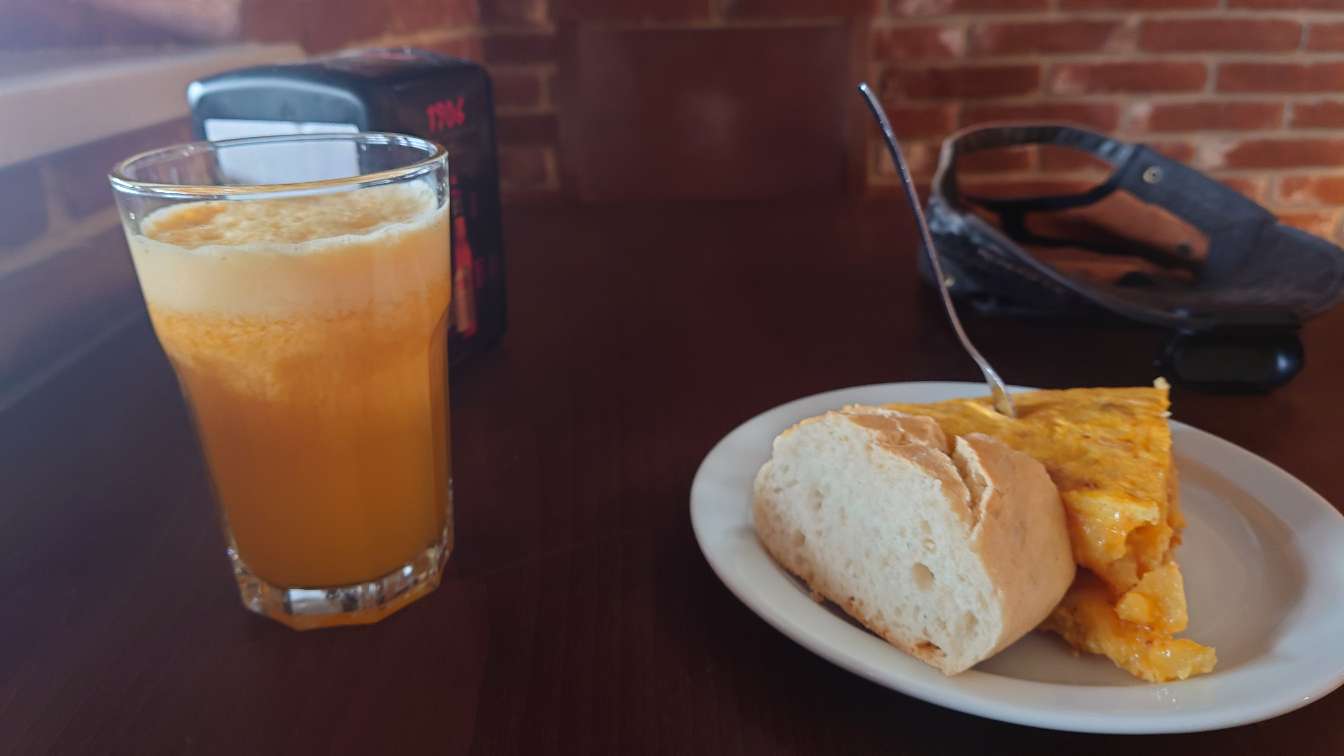Jeg bestiller friskpresset appelsinjuice og en skøn Tortilla de patatas (spansk omelet med kartofler), noget jeg har fået alt for lidt på min tur.