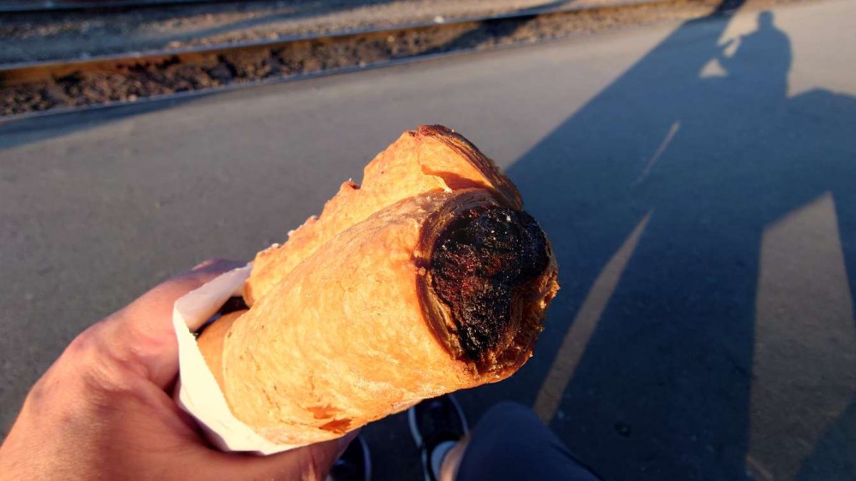 Jeg går igen rundt på banegården, for at føle stemningen og opleve den anderledes kultur. Jeg finder lidt efter en café, hvor jeg køber en Cappuccino og en butterdejs kage (160gr), med noget creme af en slags… 13,5kr. De her priser kan jeg bestemt li 😀