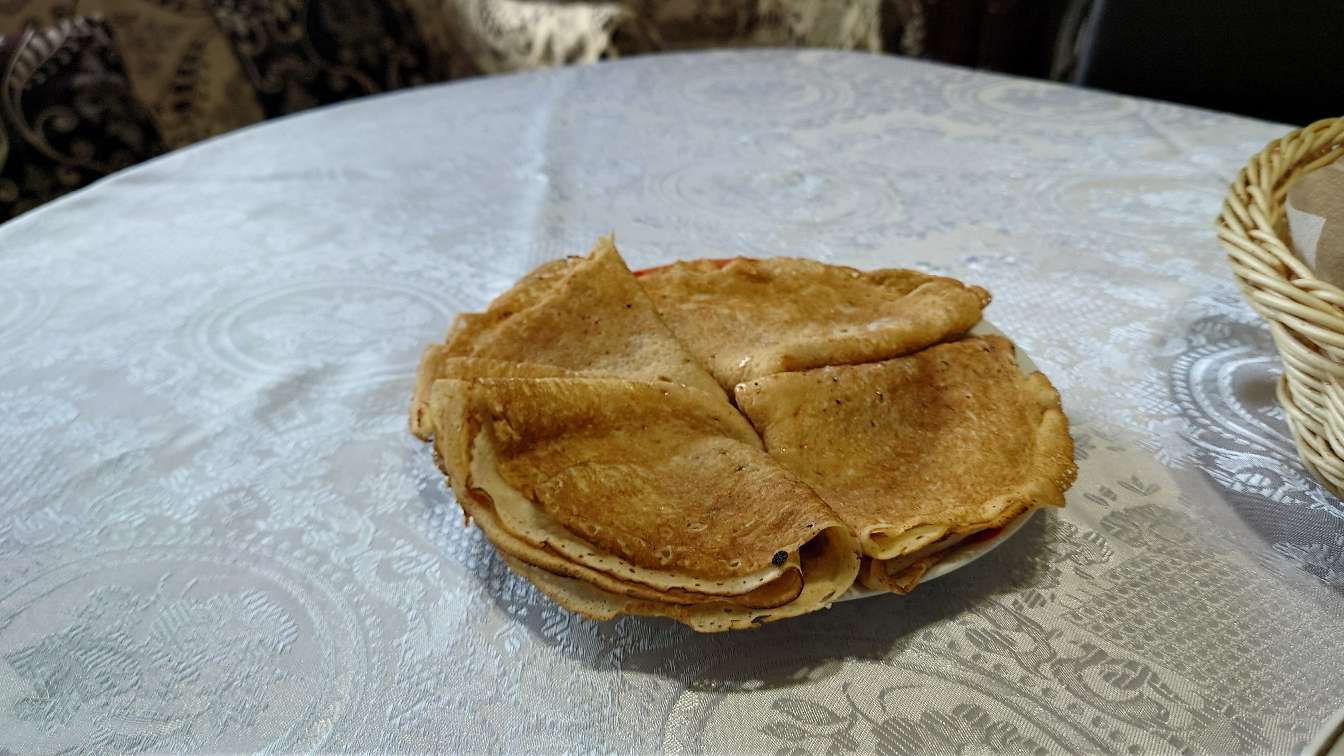 Som frygtet kommer der, inden jeg er færdig med gullaschen, en tallerken med 4 pandekager fyldt med blomme marmelade ind… maven er ved at springe… men det vil jo være uhøfligt ikke at smage… eller spise dem alle 😀
