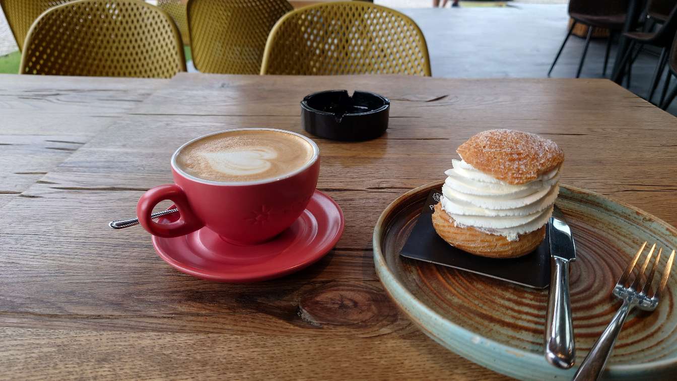 Lidt uden for Bran, finder jeg et bageri og cafe, som virker som et godt sted at få tiden til at gå. Klokken er 10.45, så et passende tidspunkt til en Cappuccino med en flødekage😀