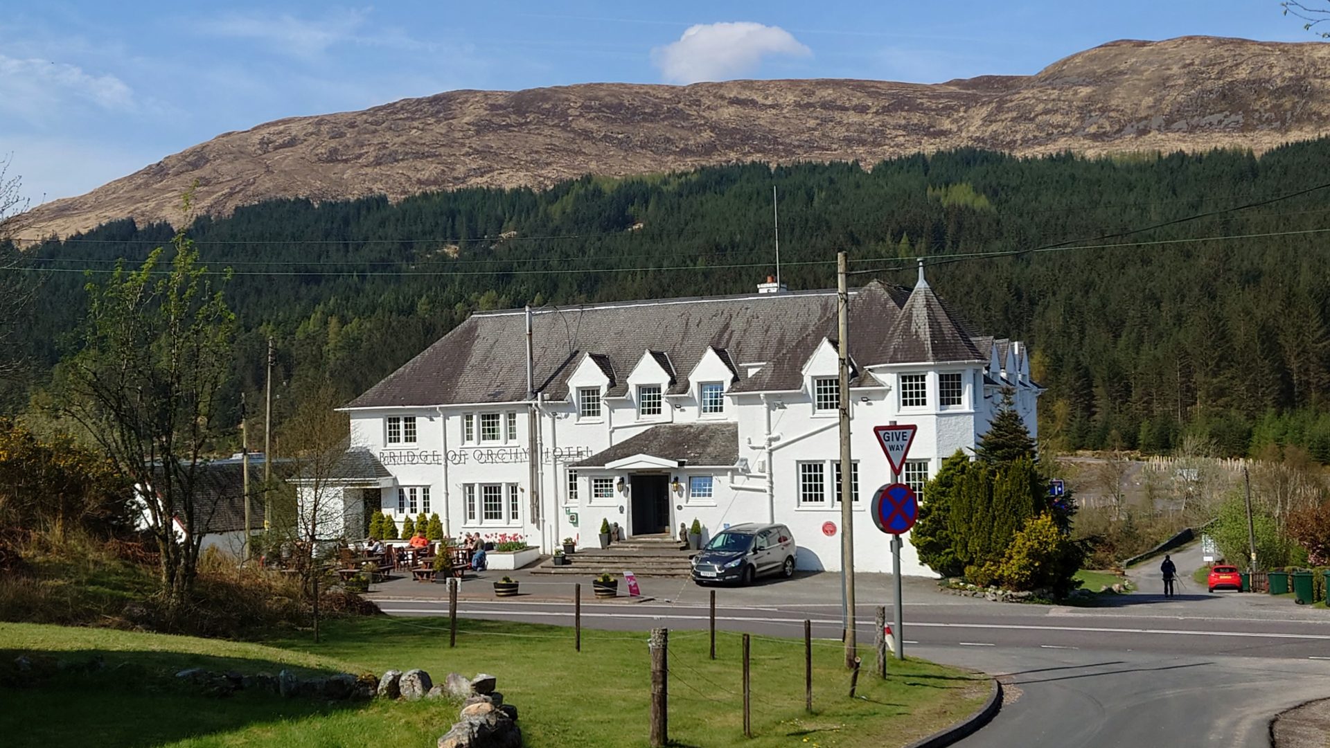 Da jeg næsten er færdig med at spise kommer Mike og Tracy og sætter sig. Vi bruger den næste lille time sammen – hvorefter vi forsøger at få vores værrelse – klokken er nu 14.15, men det er stadig lige tidligt nok, jeg får besked på at komme tilbage om 15 min. Jeg går tilbage til broen (Bridge of Orchy) og nyder udsigten i en lille halvtime og kommer så tilbage hvor mit værelse er nu klar.