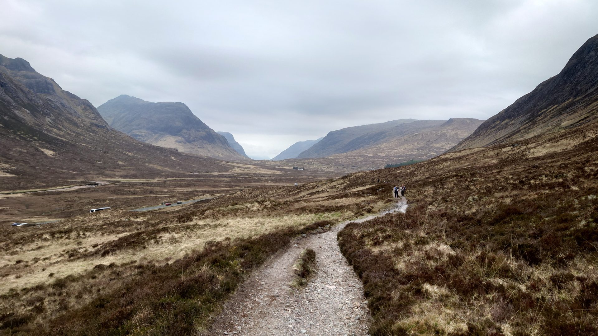 De første 5km går langs bjergsiden med vejen til venstre. Bilerne kan for det meste høres, men det er ikke meget generende. Udsigten er betagende smuk, med de bare og mørke skotske bjerge til begge sider.
