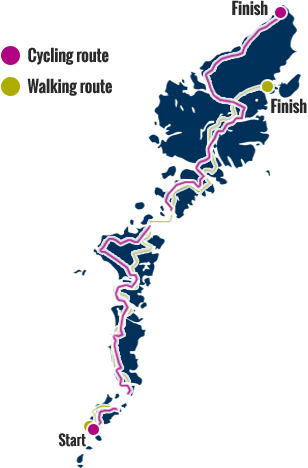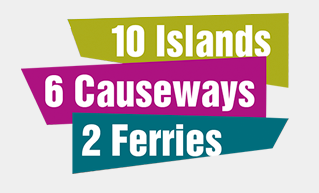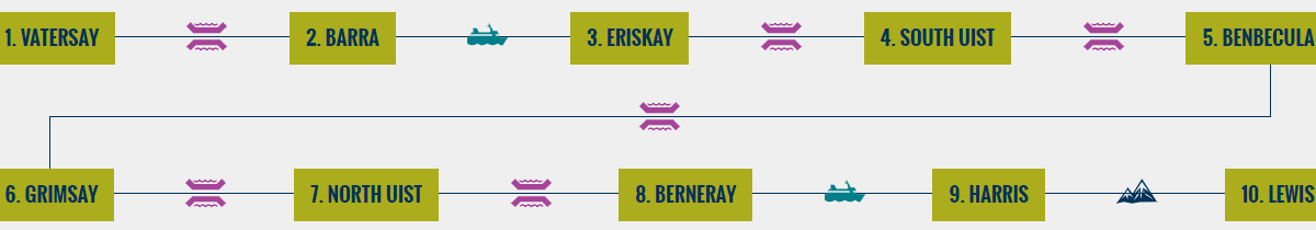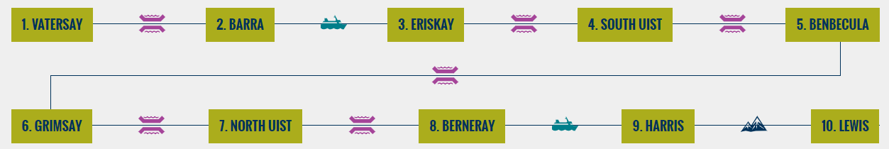 The Hebridean Way går fra syd til nord og der vandres på ikke mindre end 10 øer. Som illustrationen viser nedenfor, er øerne forbundet enten af causeways, færger eller endda et bjerg.