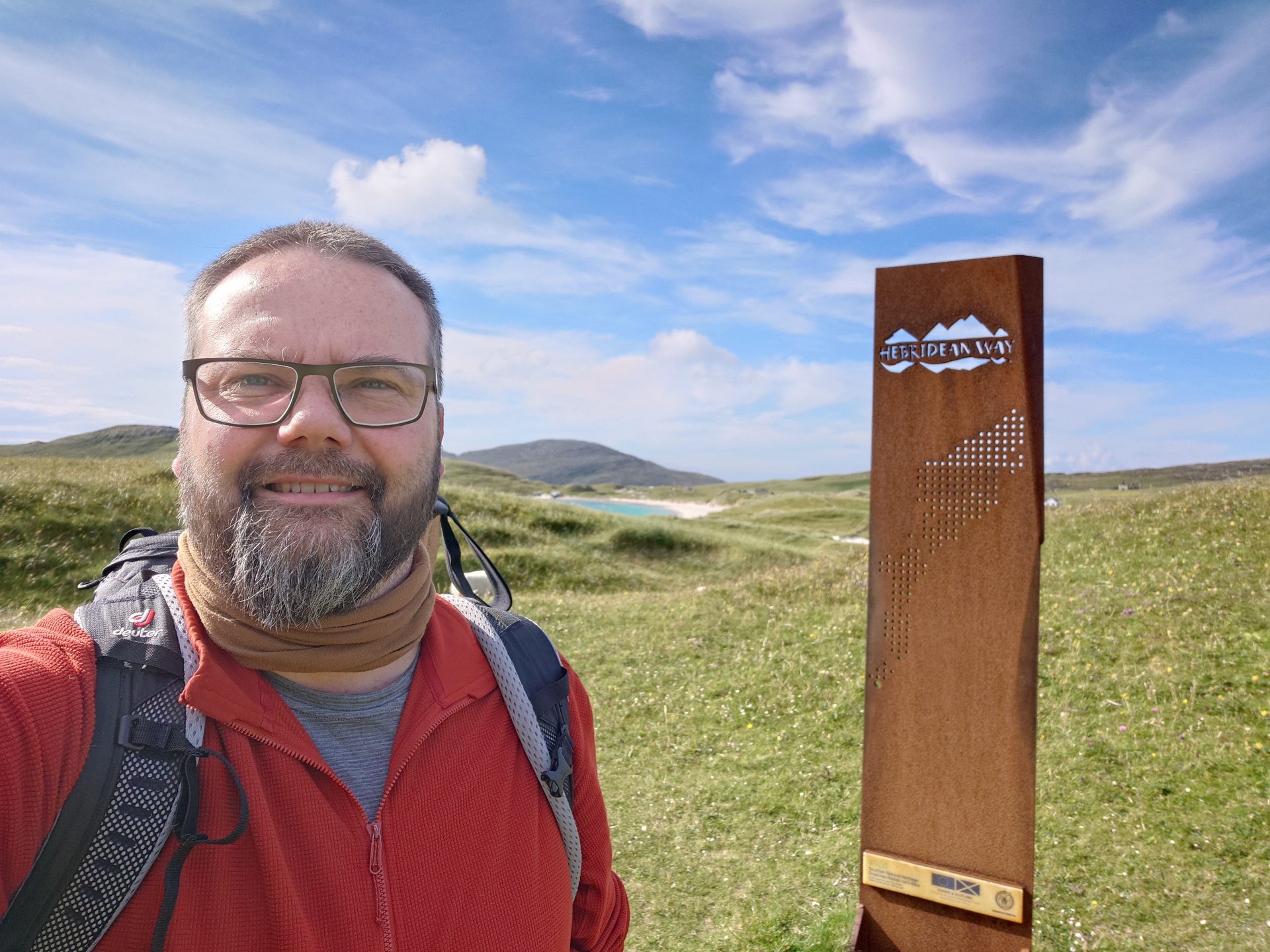 Jeg blev hentet 9.00 som aftalt, og kørte en smuk tur til øen Vatersay hvor ruten begynder. Jeg tager en par billeder og video ved start punktet (the southern terminus).