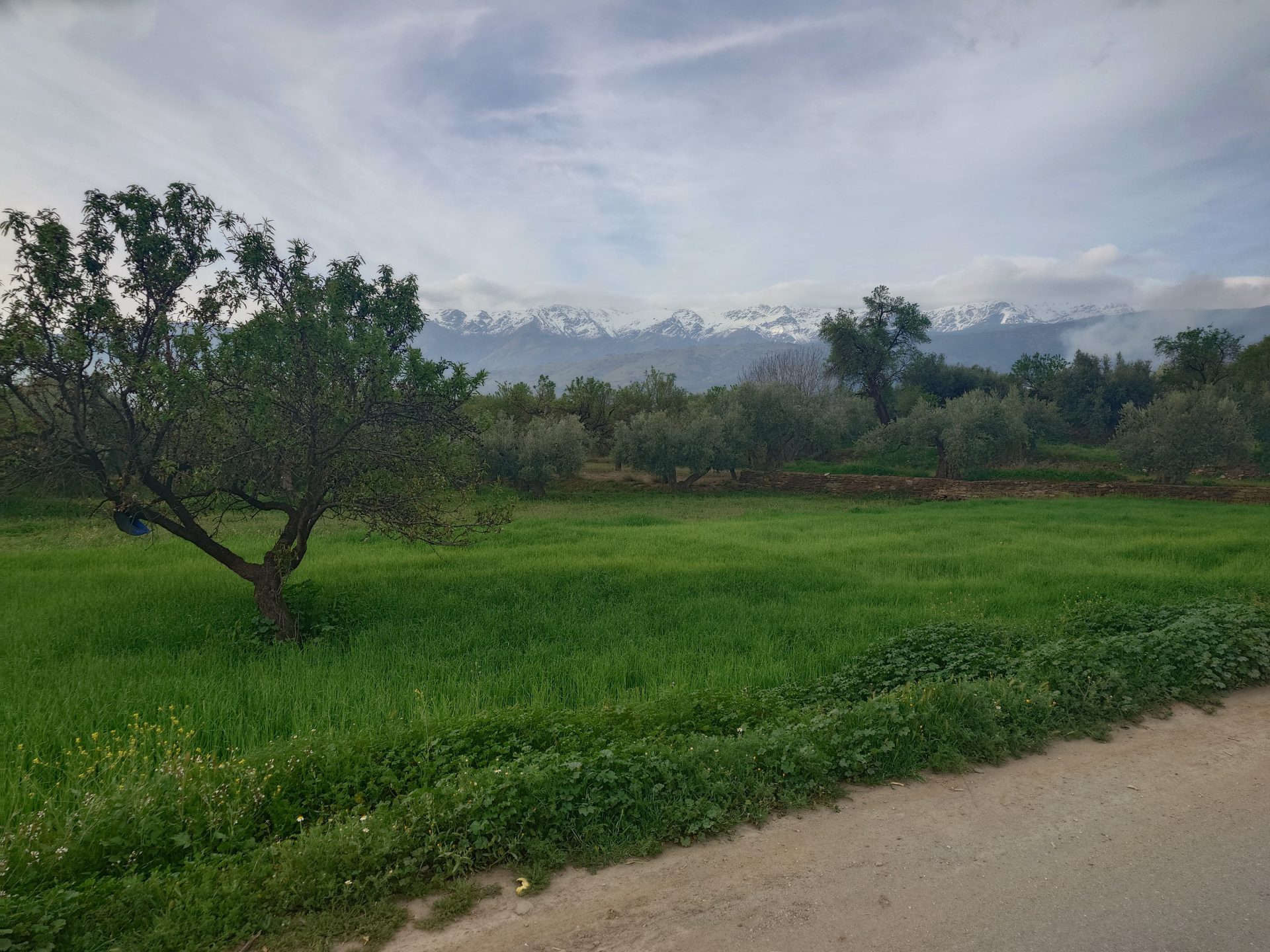 Efter godt 5 km (trods min guide sagde 7-8km) møder jeg den officielle rute. Jeg går i en lang periode langs de smukke sneklædte bjerge som jeg har set på de seneste dage. Der er en ubeskrivelig stilhed, hvor eneste jeg hører er fuglsang, en stille brise.der er kun 9 grader varmt, men jeg må snart tage fleece trøjen af, mens temperaturen nok stiger nogle få grader.